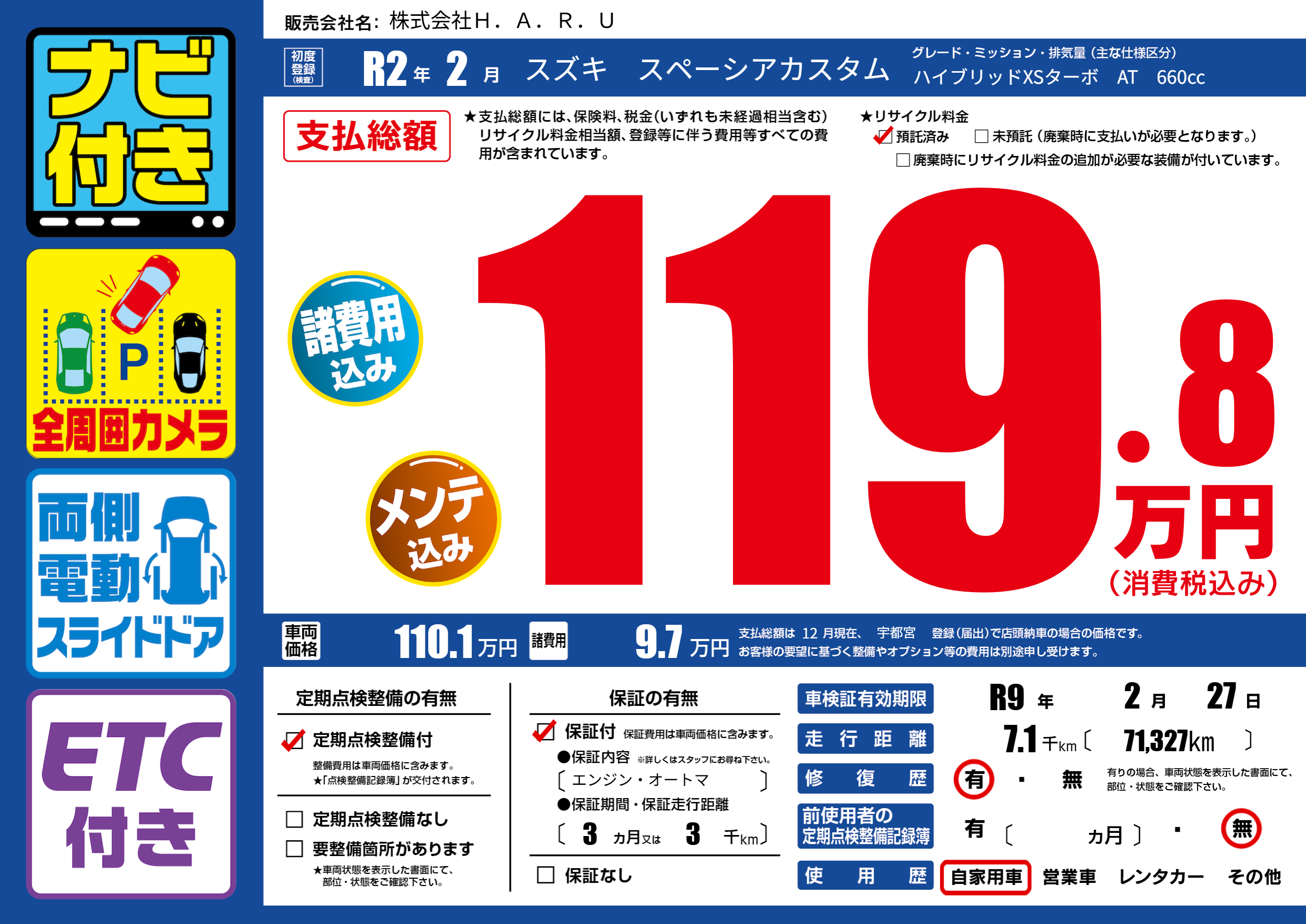 | 車名 | スズキ スペーシアカスタム | グレード ミッション 排気量 |