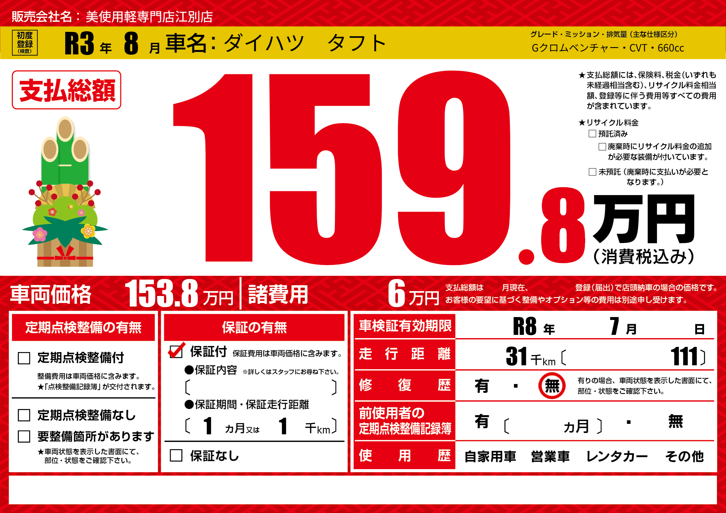 | 走行キロ | 3.1万km | 初年度登録 | R3年8月 |