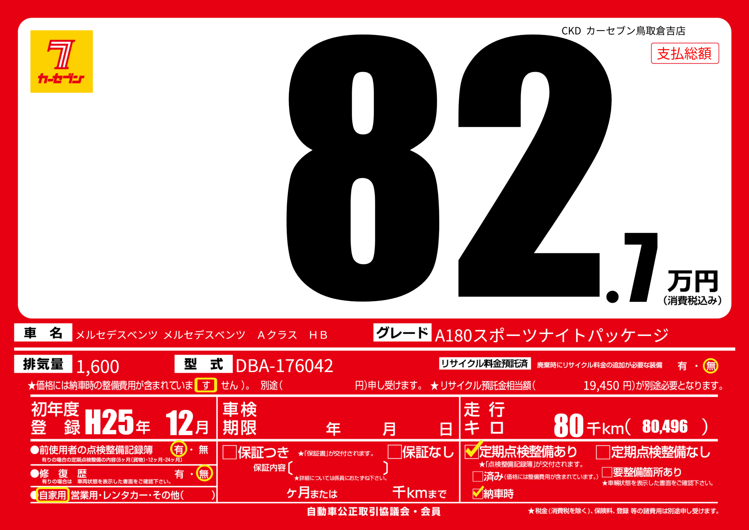 | 車名 | メルセデスベンツ メルセデスベンツ Aクラス HB | グレード ミッション 排気量 |
