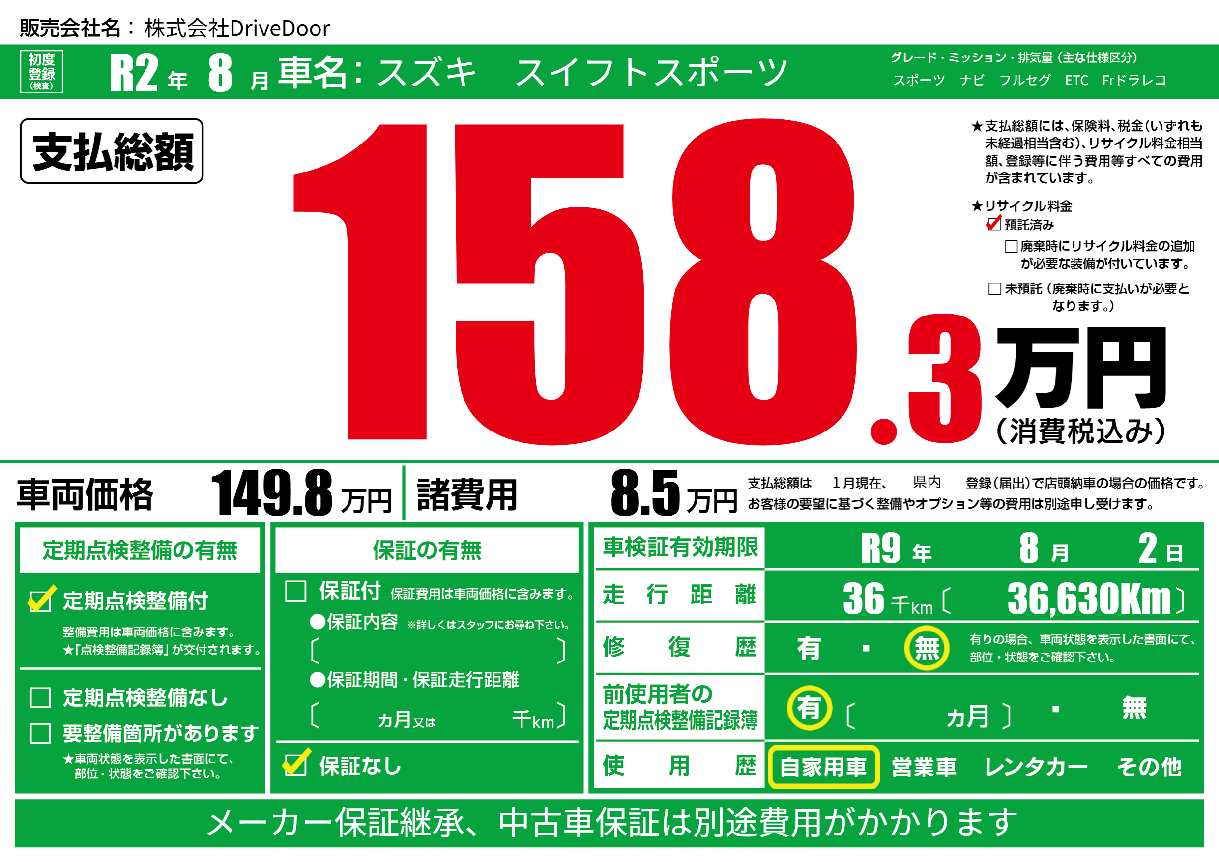 | 車名 | スズキ スイフトスポーツ | グレード ミッション 排気量 |