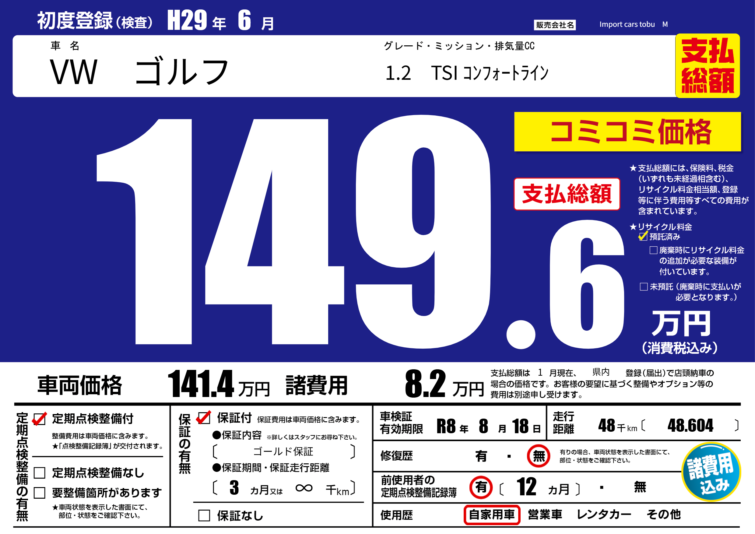 | 車名 | VW ゴルフ | グレード ミッション 排気量 |