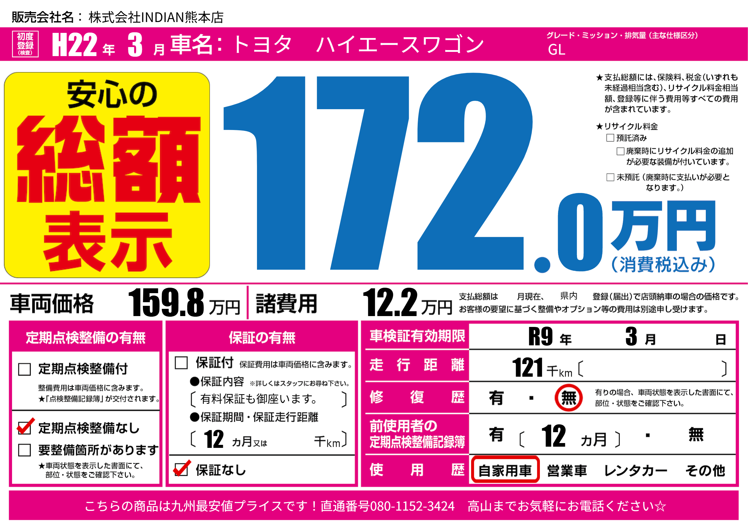 | 走行キロ | 12.1万km | 初年度登録 | H22年3月 |