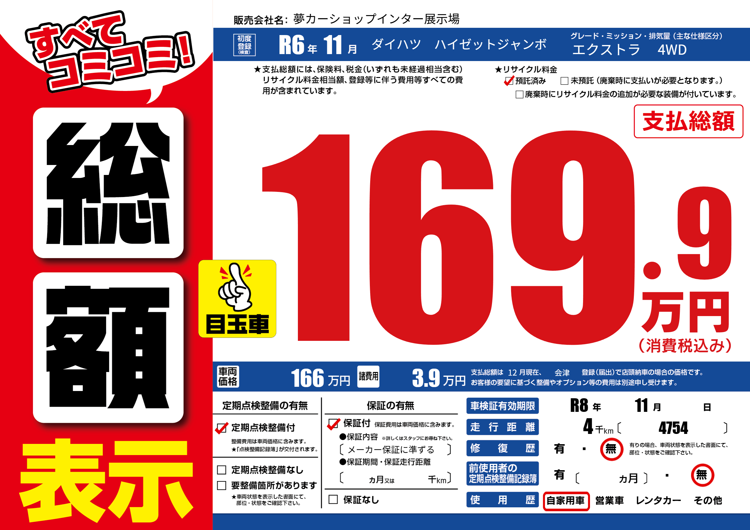 | 走行キロ | 0.4万km | 初年度登録 | R6年11月 |