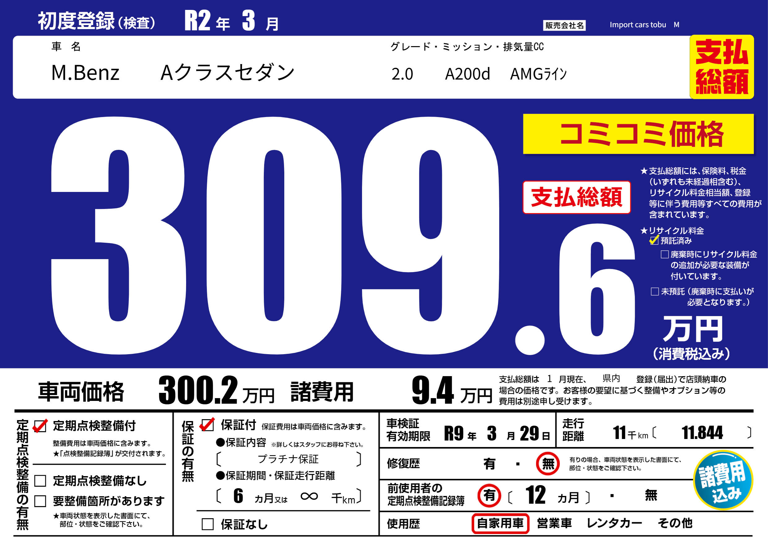 | 車名 | M.Benz Aクラスセダン | グレード ミッション 排気量 |