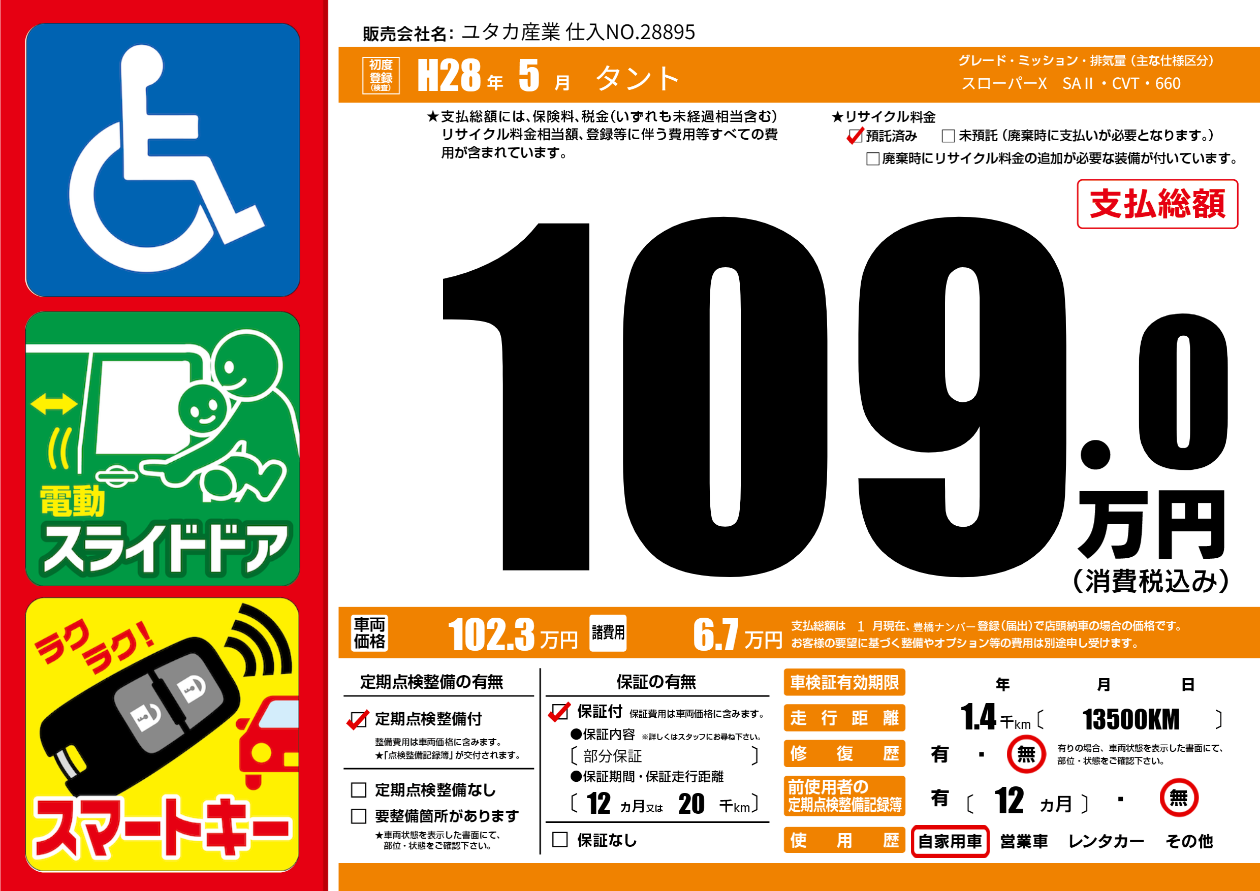 | 走行キロ | 0.1万km | 初年度登録 | H28年5月 |