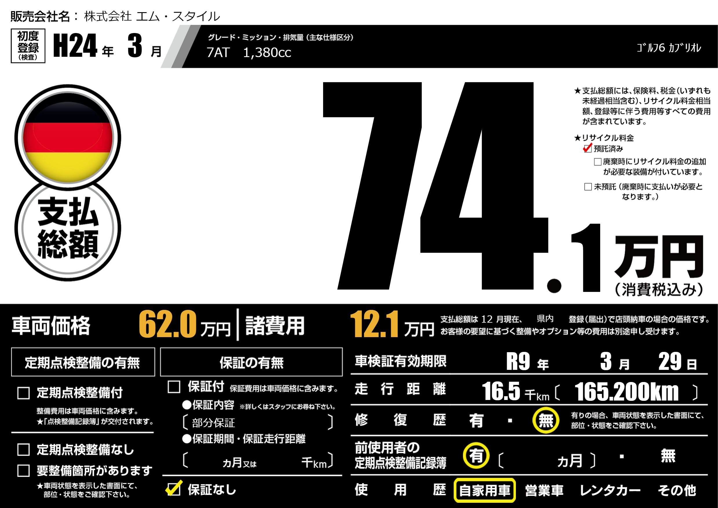 | 車名 | ゴルフ6 カブリオレ | グレード ミッション 排気量 |