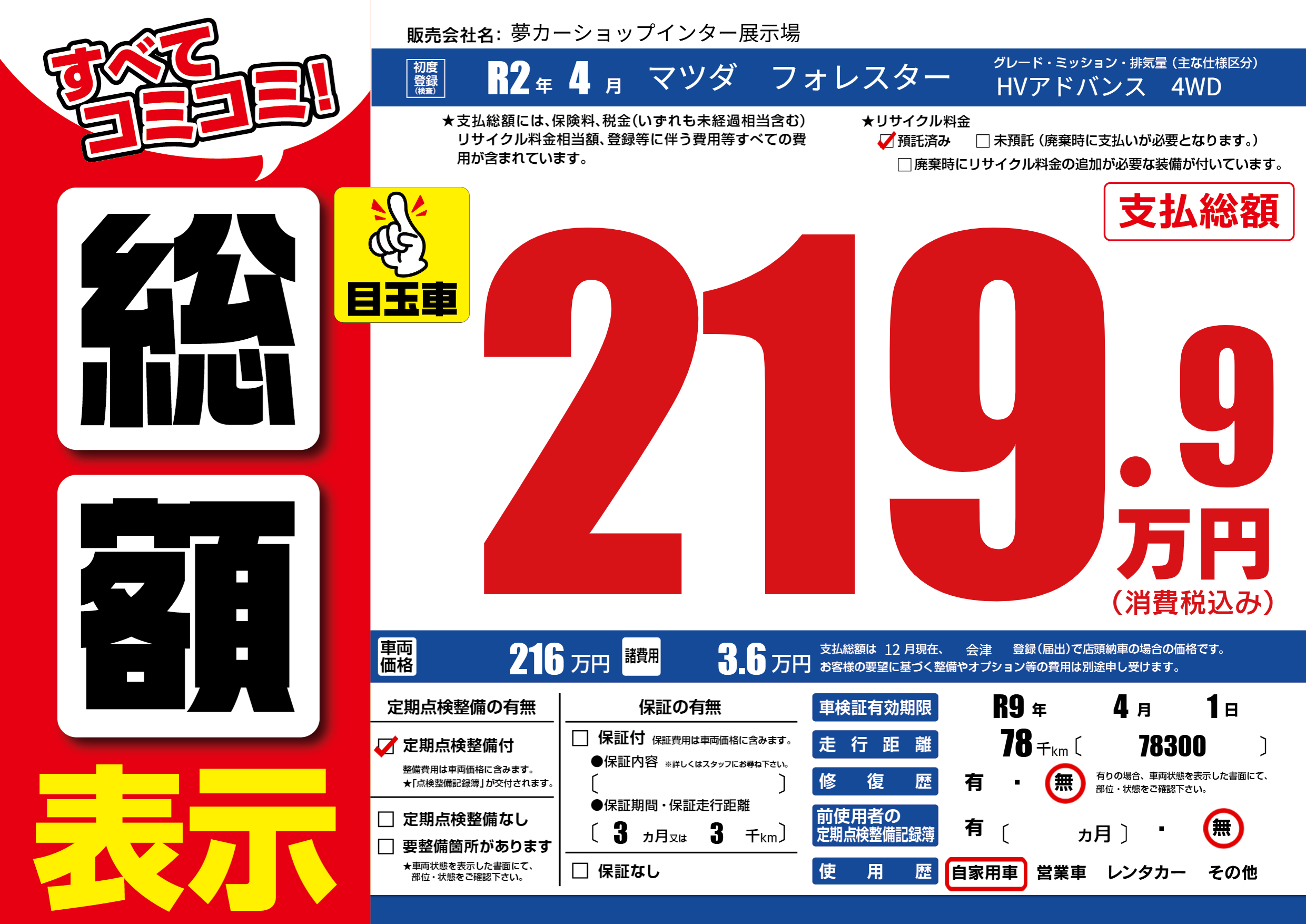 | 車名 | マツダ フォレスター | グレード ミッション 排気量 |