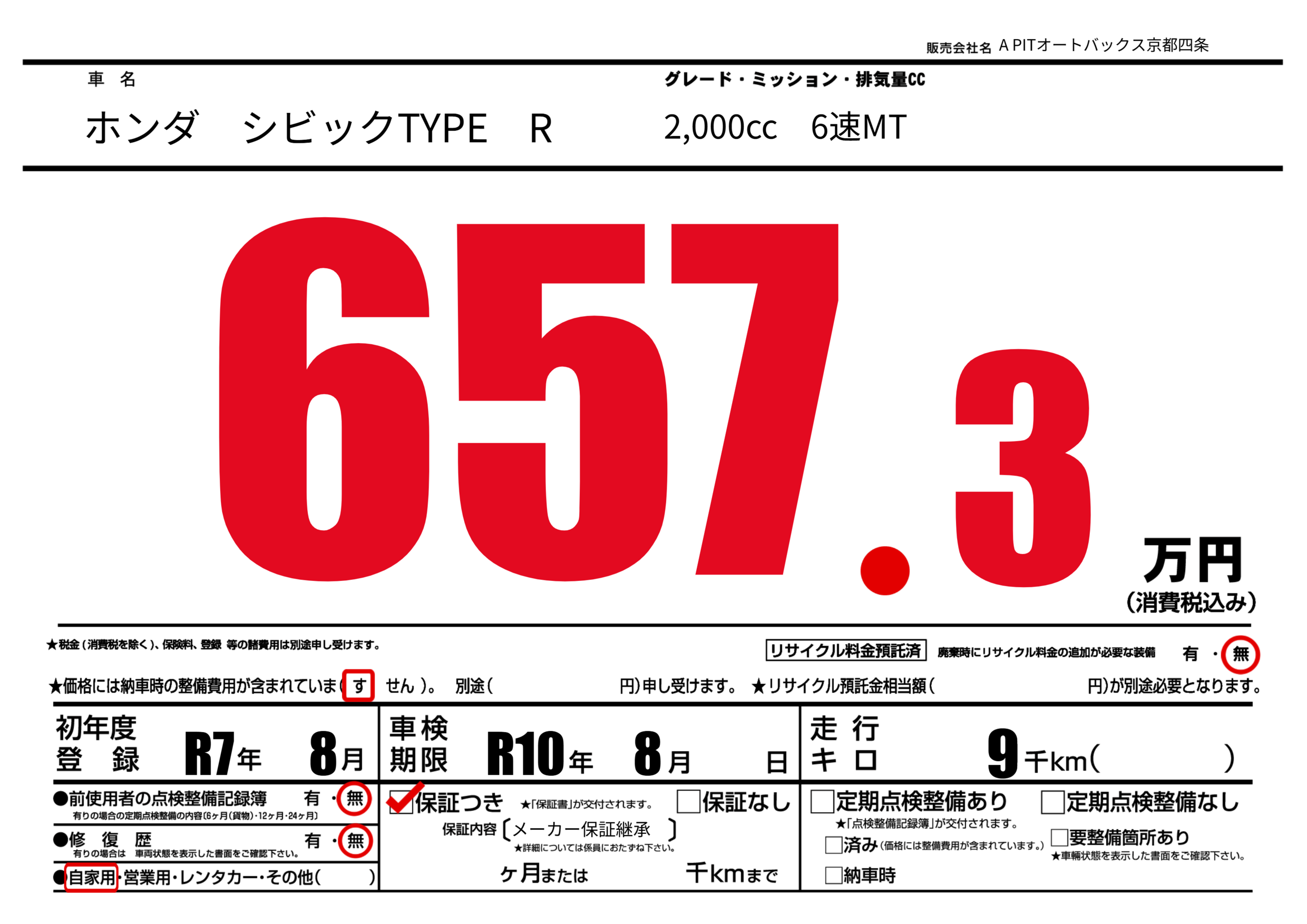 | 車検制限 | R10年 8月 - 日 | ||