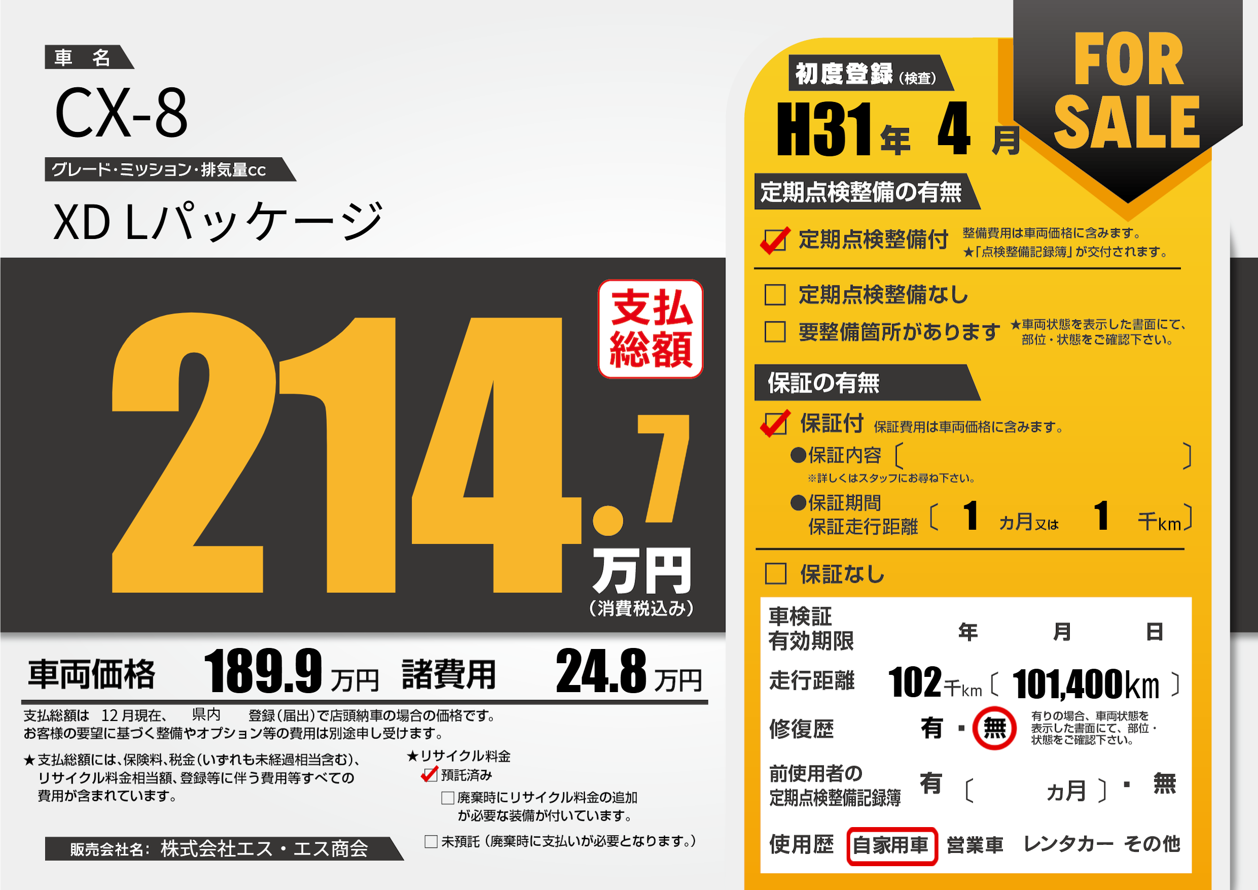 | 走行キロ | 10.2万km | 初年度登録 | H31年4月 |