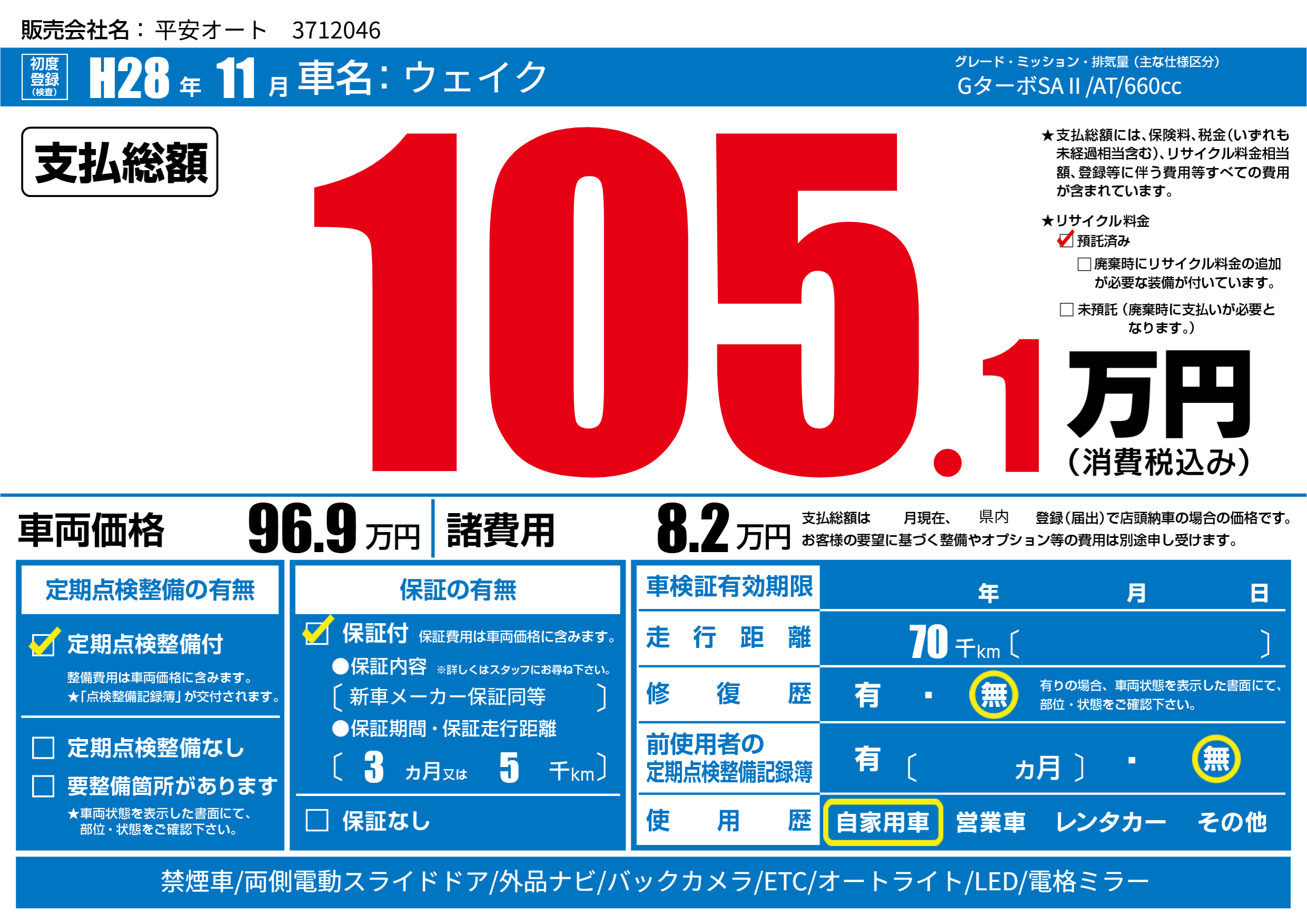 | 車名 | ウェイク | グレード ミッション 排気量 |