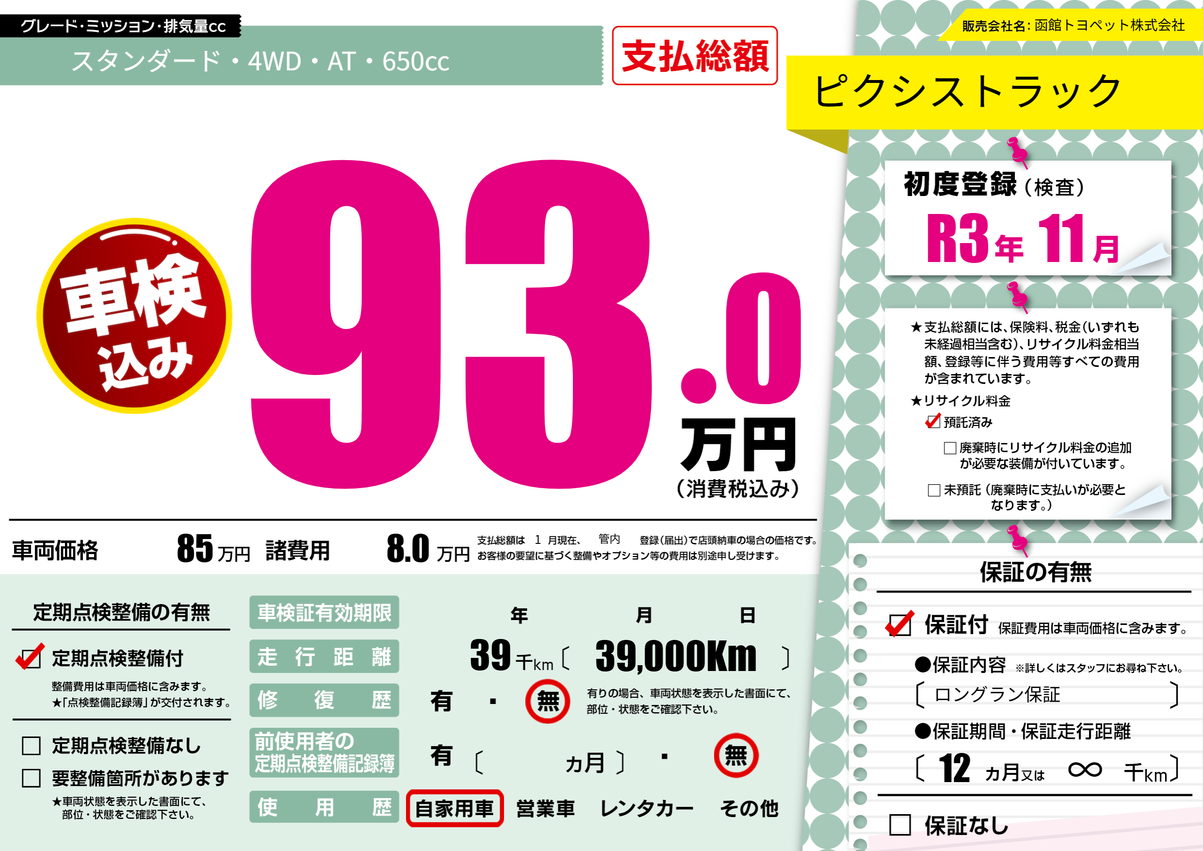 | 走行キロ | 3.9万km | 初年度登録 | R3年11月 |