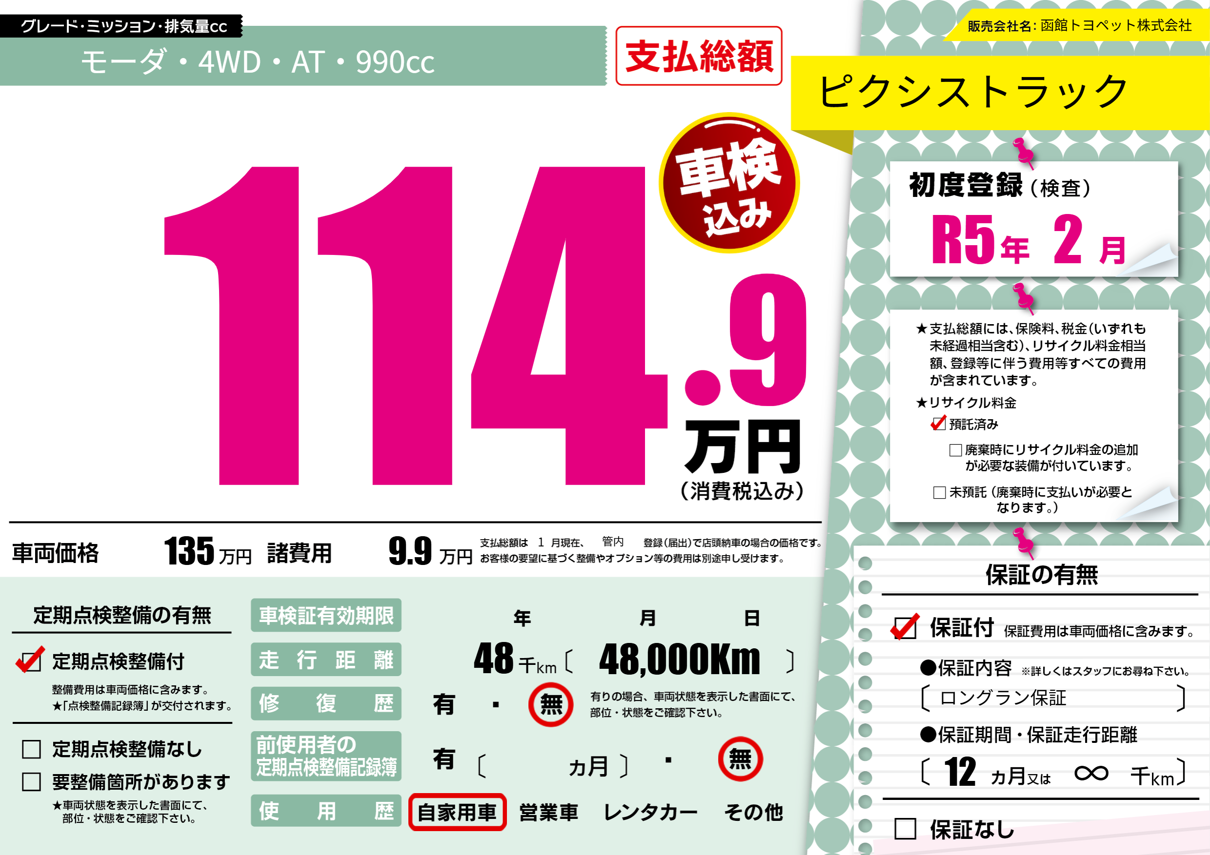 | 車名 | ピクシストラック | グレード ミッション 排気量 |