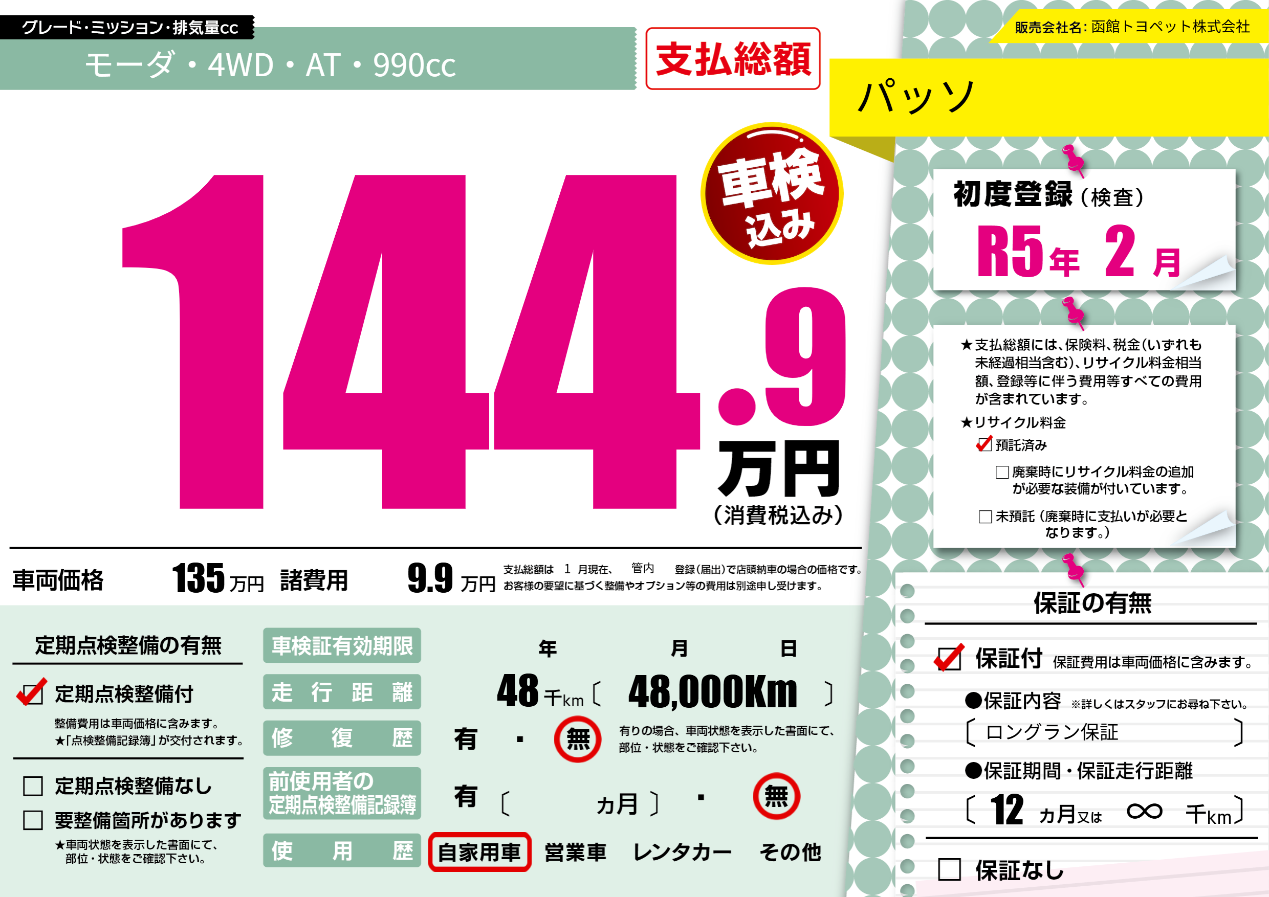 | 車名 | パッソ | グレード ミッション 排気量 |
