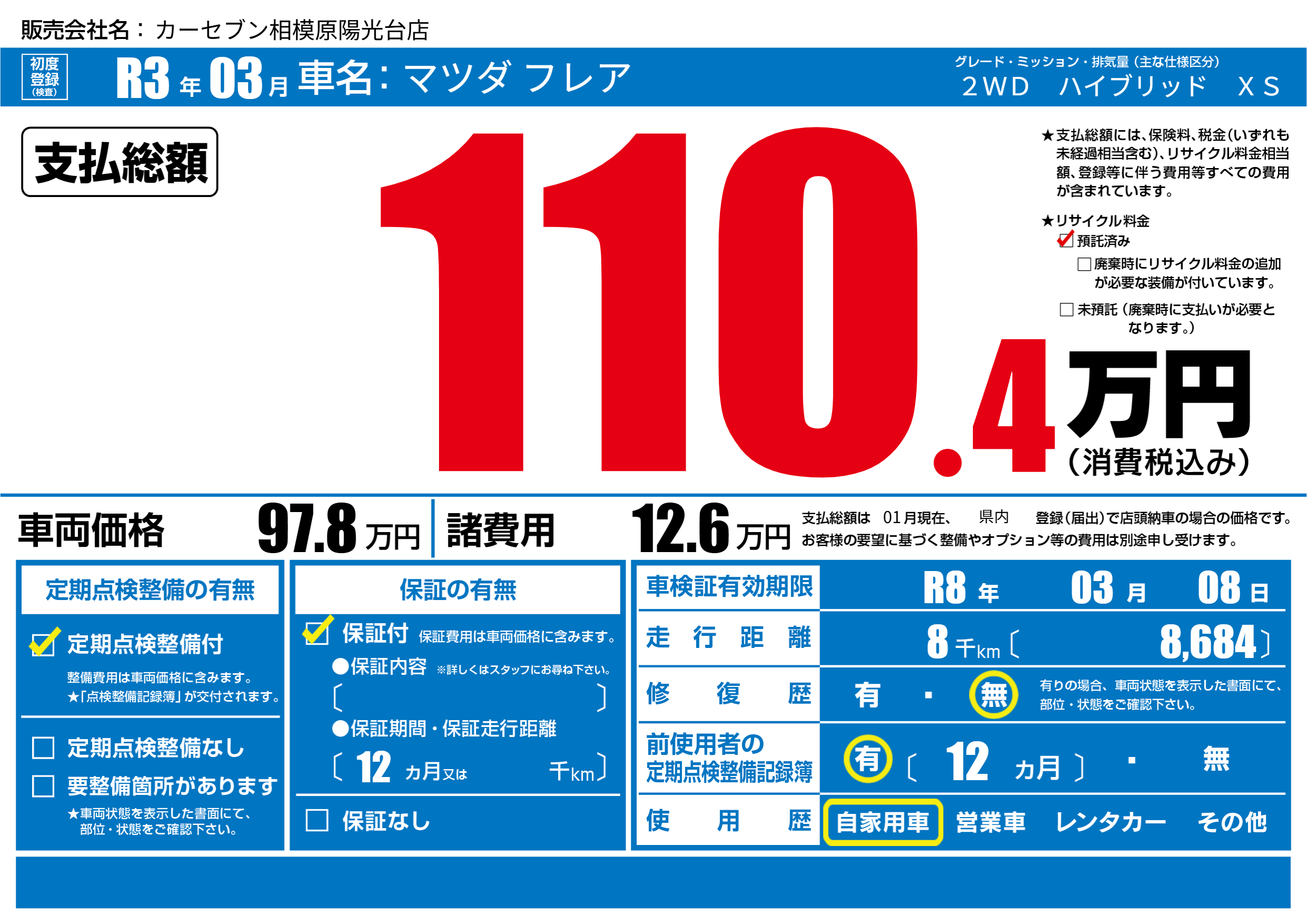 | 車検制限 | R8年 03月 08日 | ||