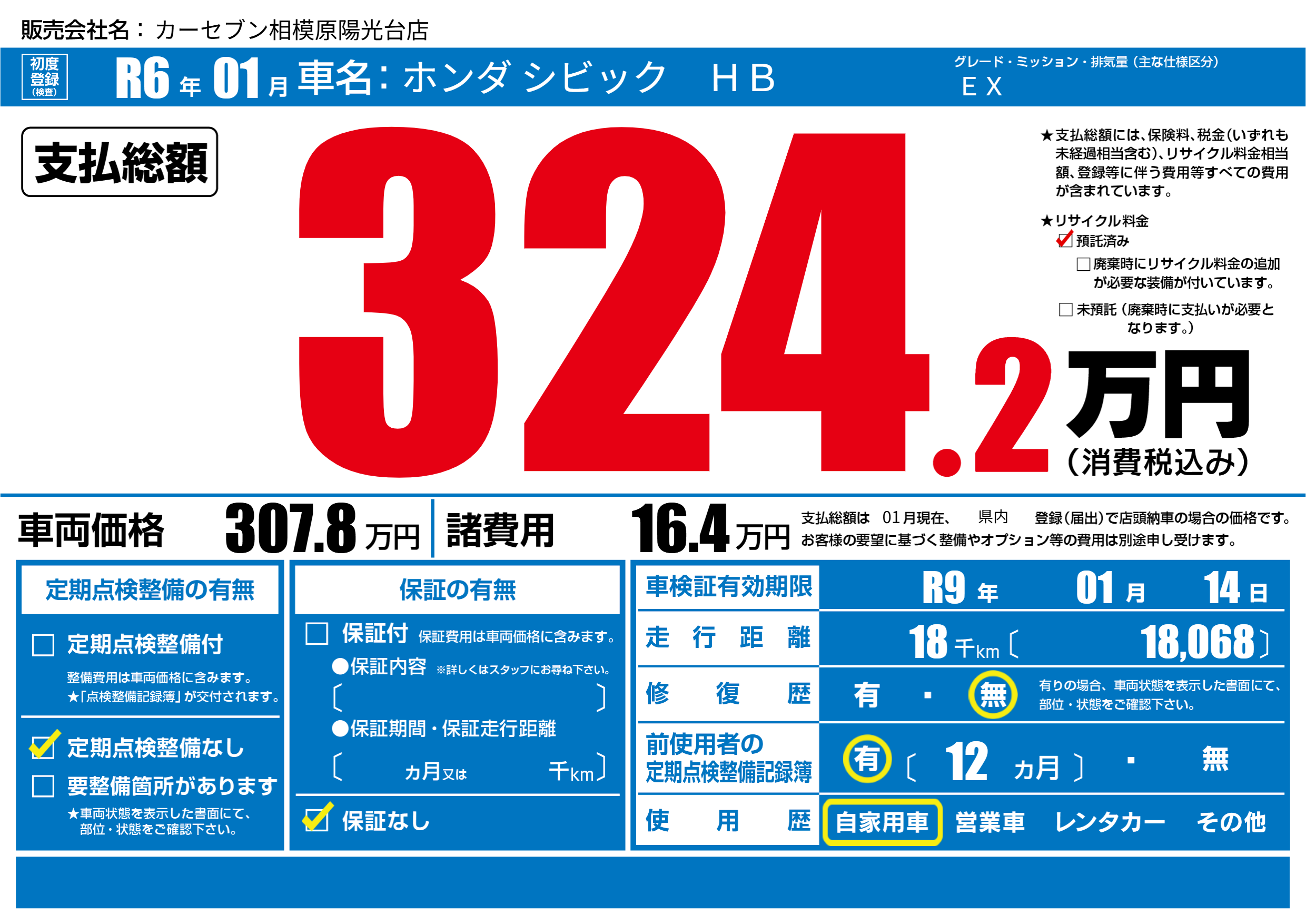 | 車名 | ホンダ シビック HB | グレード ミッション 排気量 |