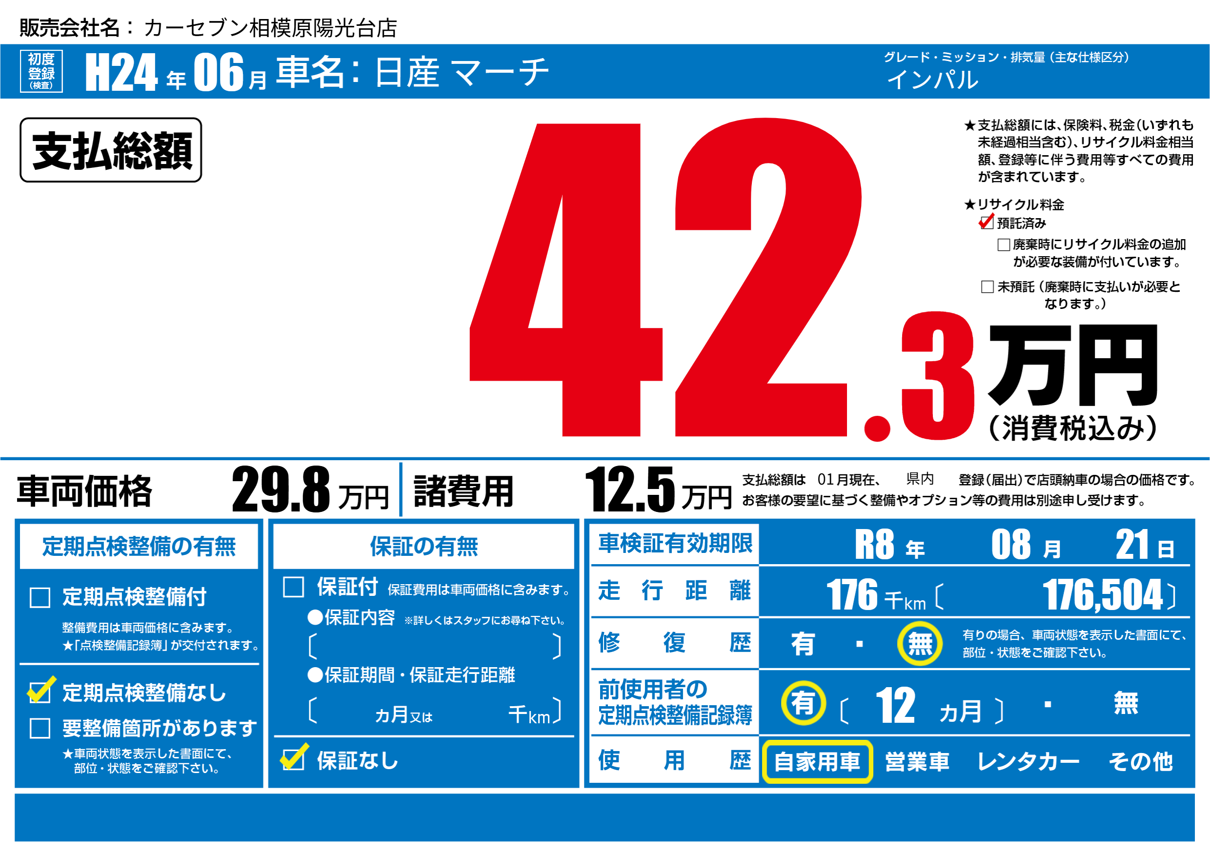 | 車名 | 日産 マーチ | グレード ミッション 排気量 |