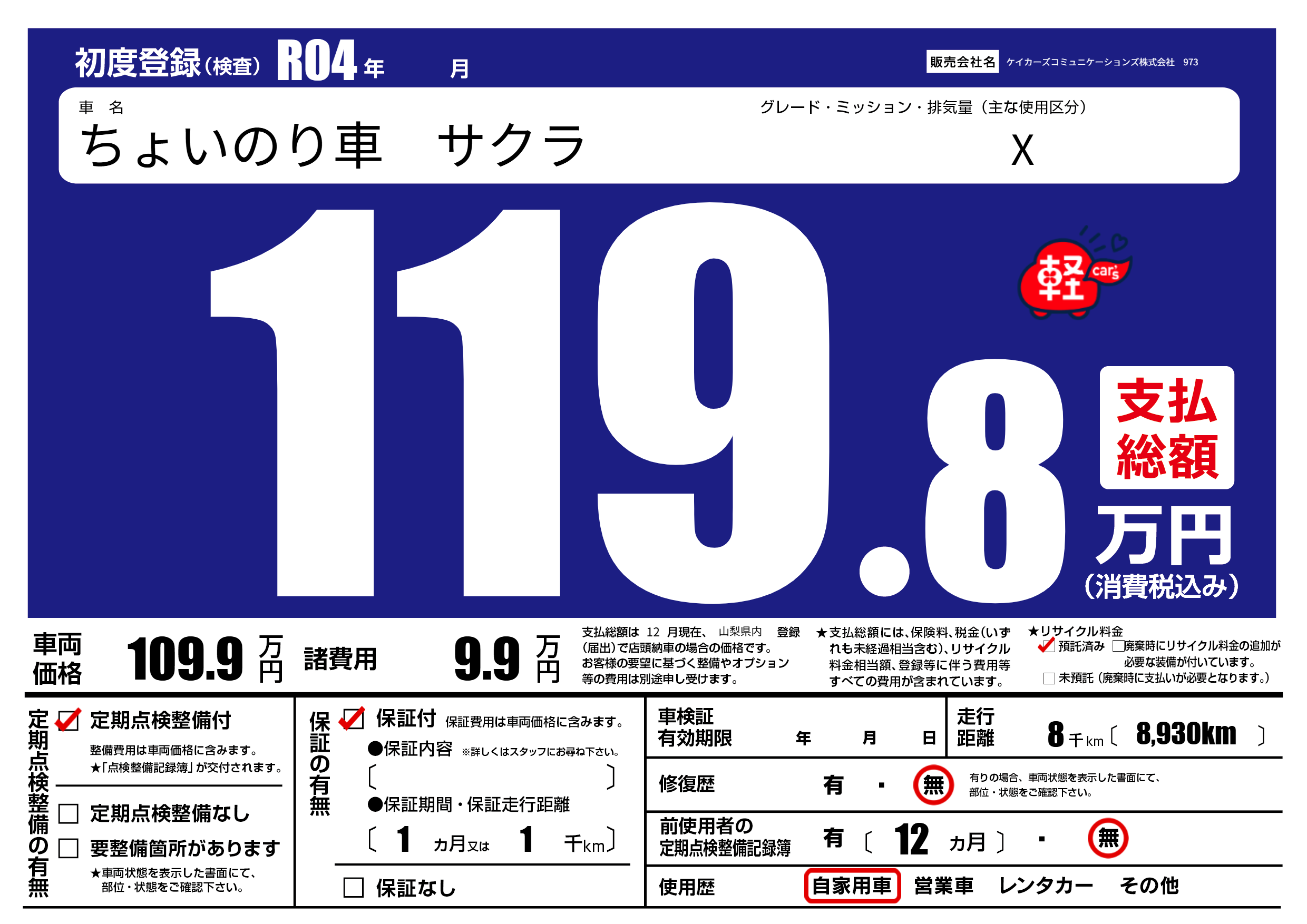 | 車名 | ちょいのり車 サクラ | グレード ミッション 排気量 |