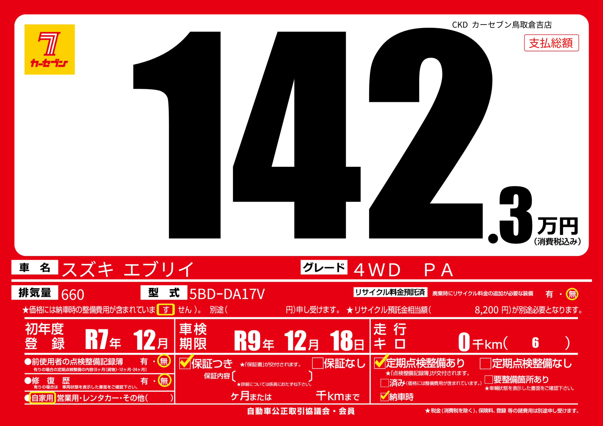 | 走行キロ | - | 初年度登録 | R7年12月 |