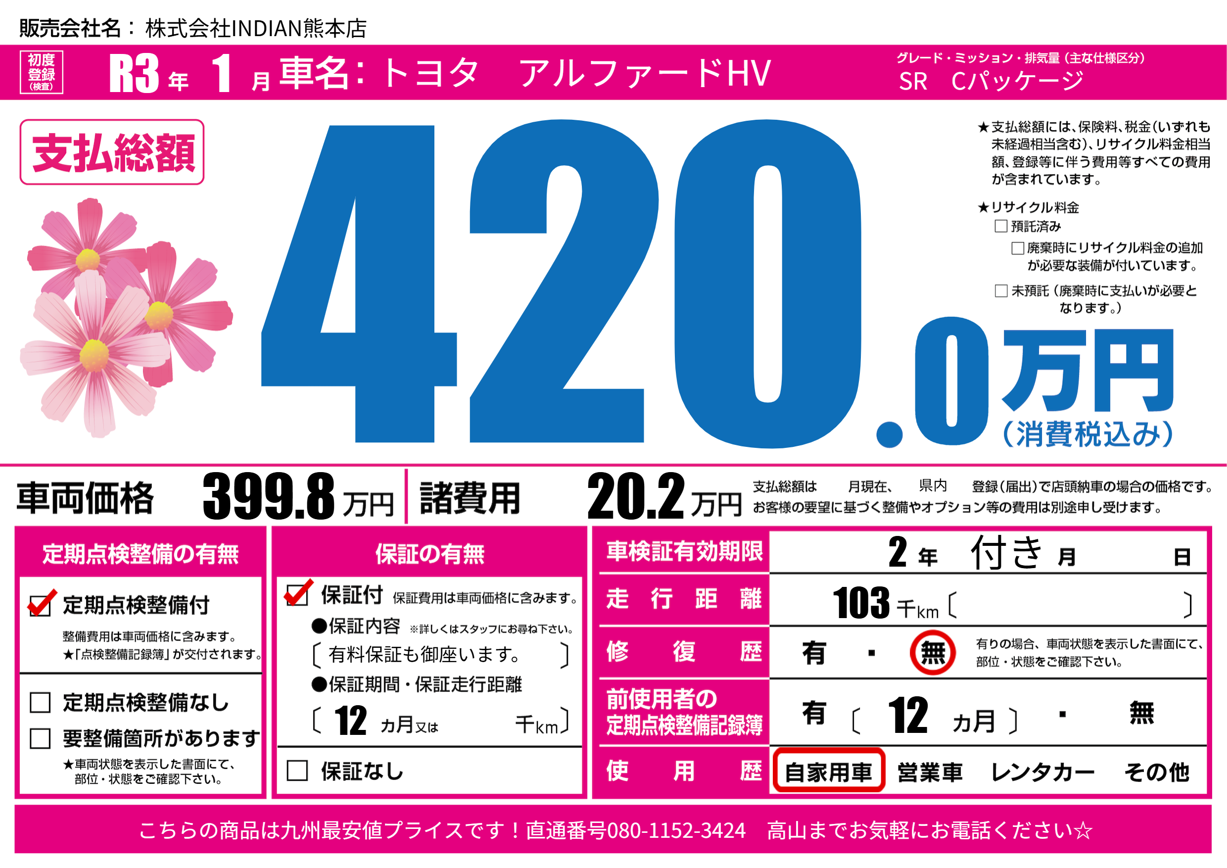 | 車名 | トヨタ アルファードHV | グレード ミッション 排気量 |