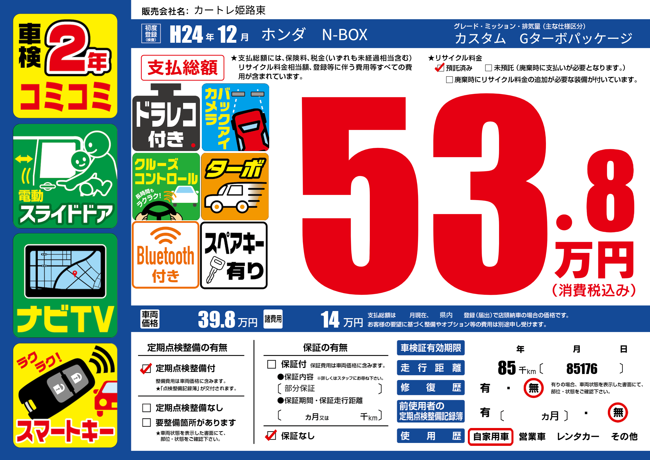 | 車名 | ホンダ N-BOX | グレード ミッション 排気量 |