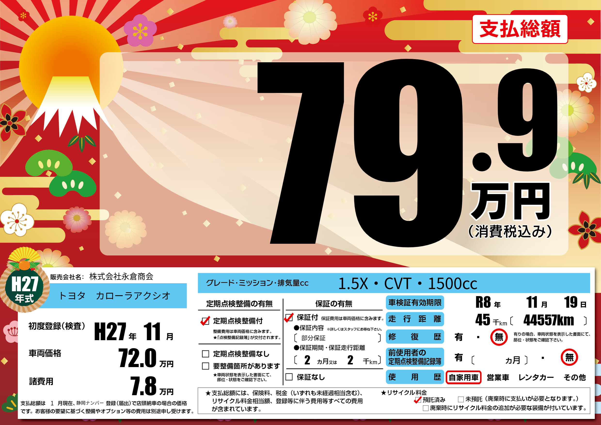 | 車名 | トヨタ カローラアクシオ | グレード ミッション 排気量 |