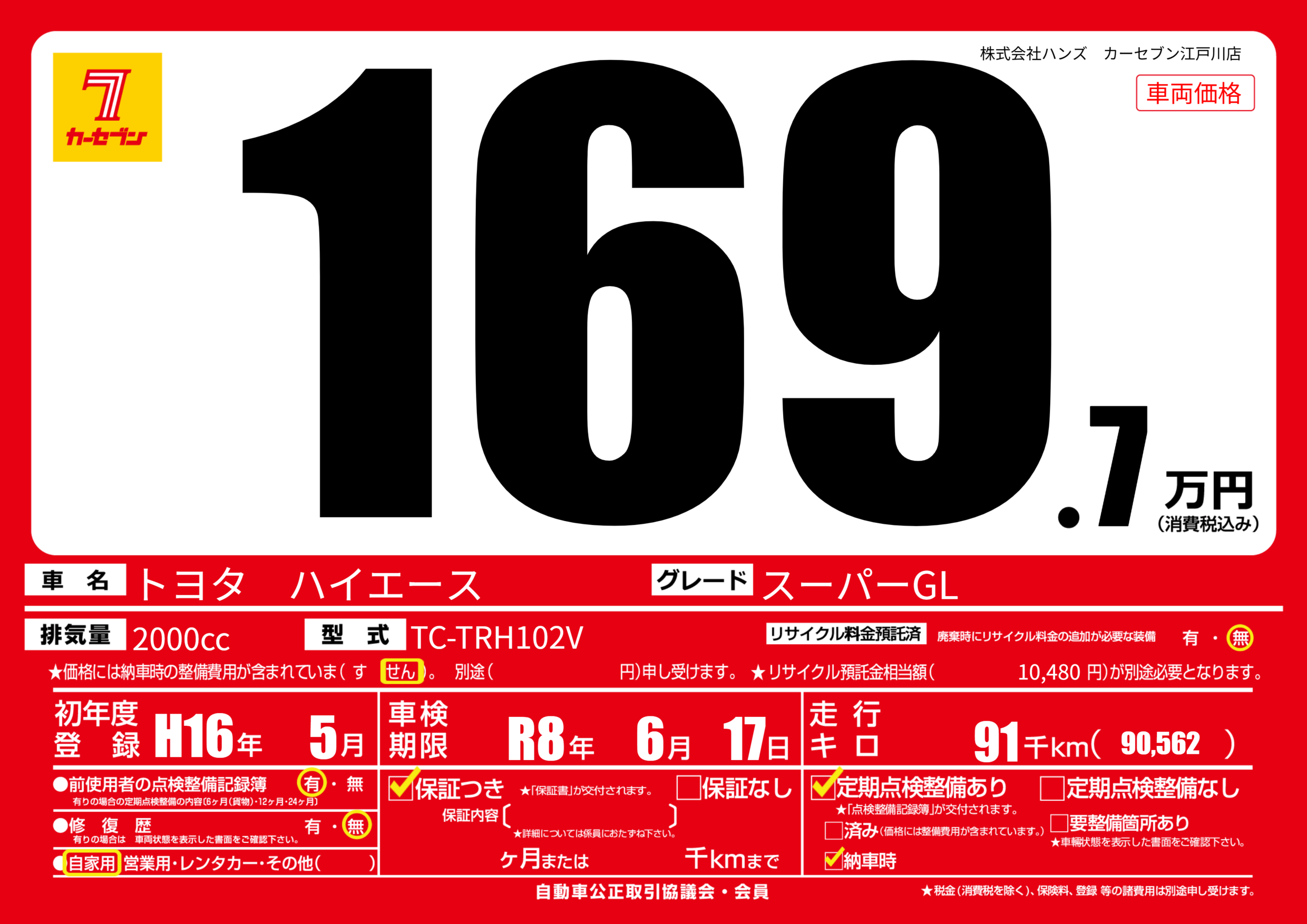 | 走行キロ | 9.1万km | 初年度登録 | H16年5月 |