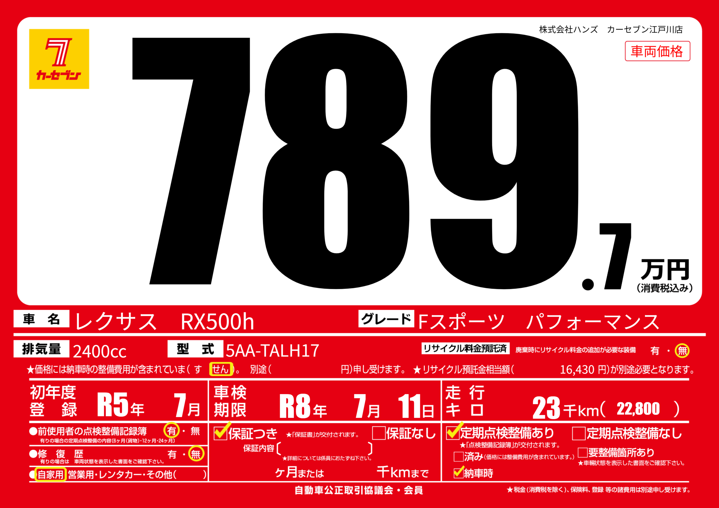 | 走行キロ | 2.3万km | 初年度登録 | R5年7月 |