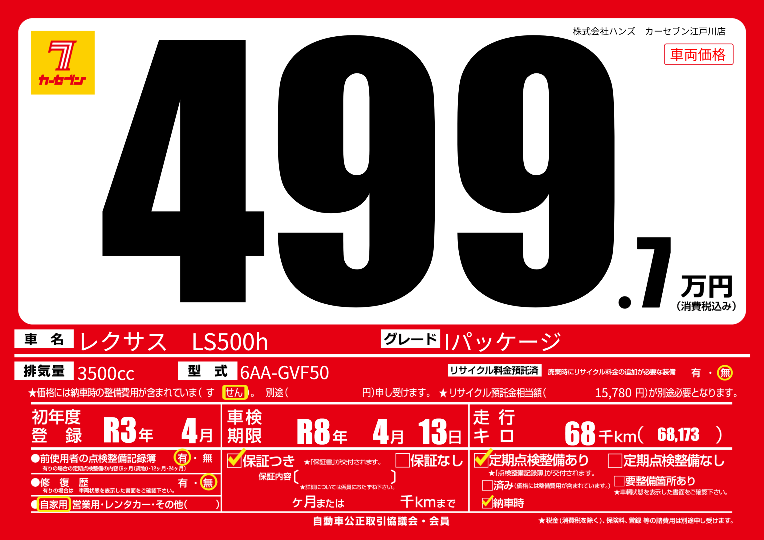 | 車名 | レクサス LS500h | グレード ミッション 排気量 |
