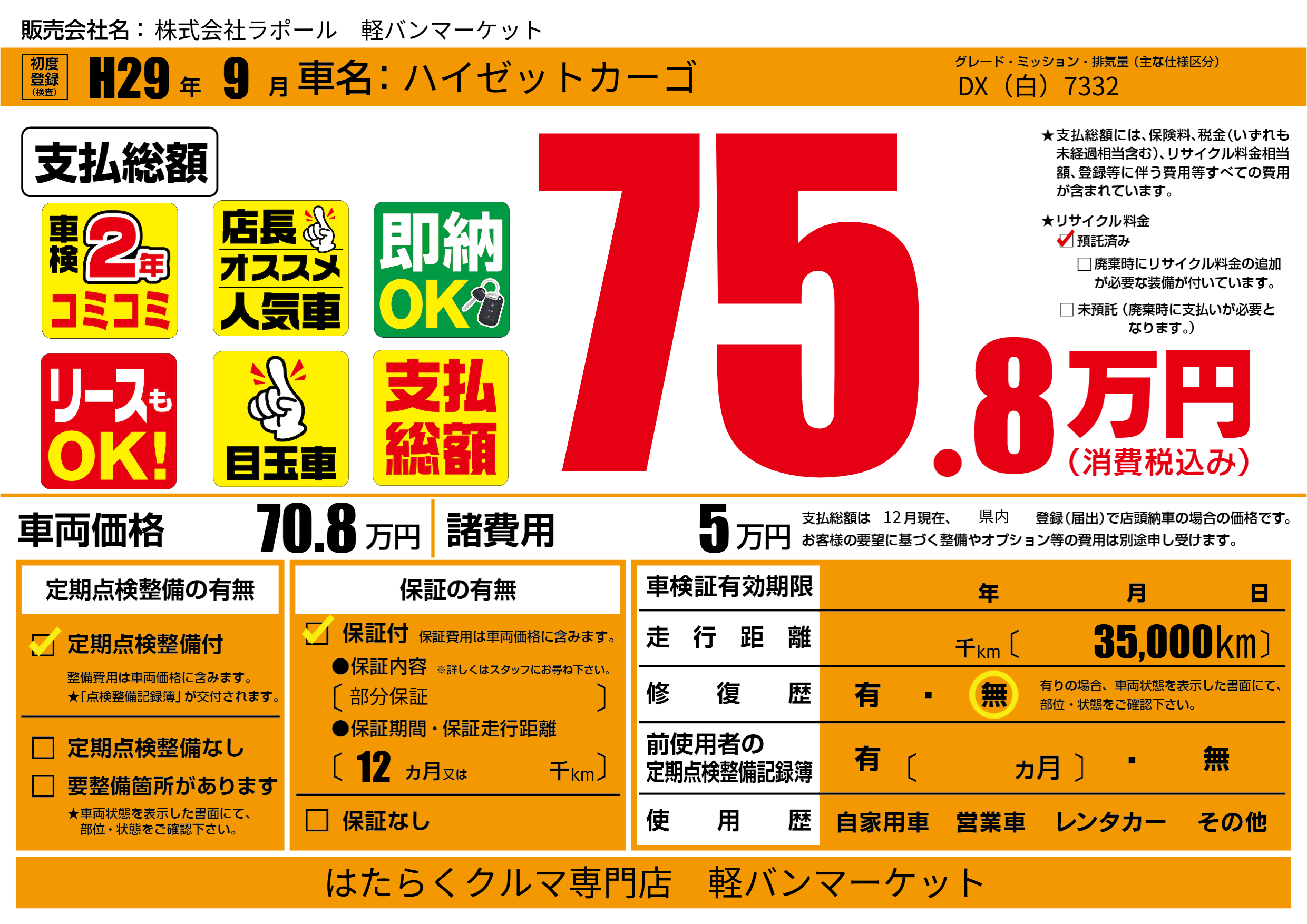 | 車名 | ハイゼットカーゴ | グレード ミッション 排気量 |