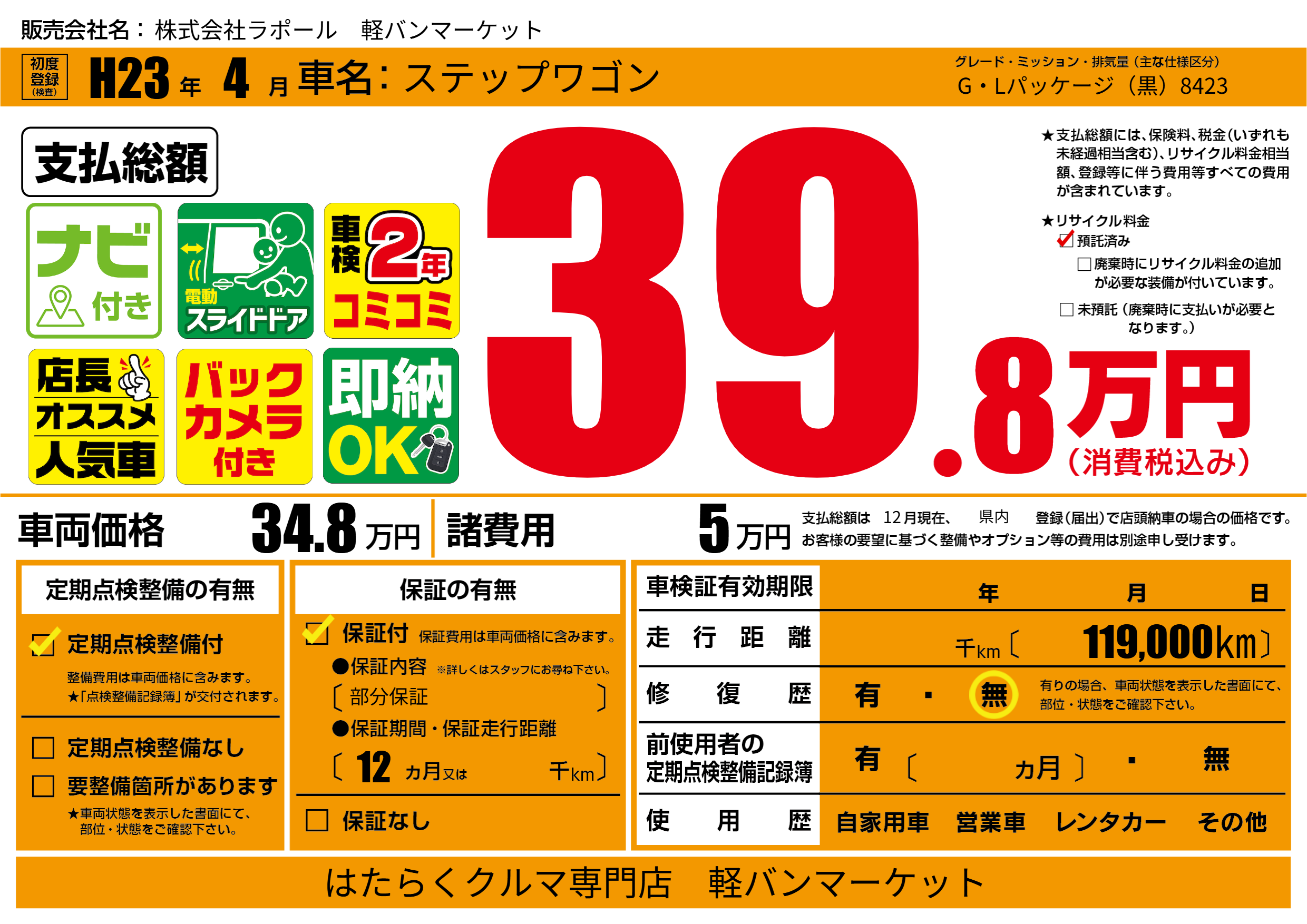 | 走行キロ | - | 初年度登録 | H23年4月 |