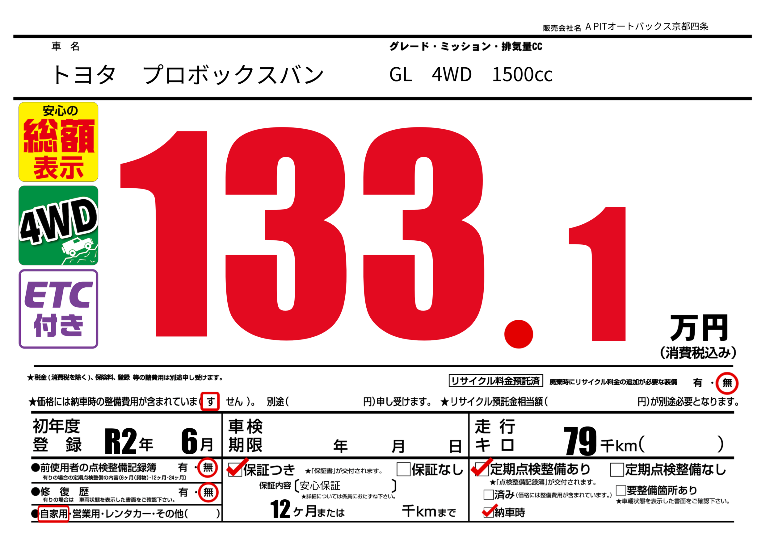 | 車名 | トヨタ プロボックスバン | グレード ミッション 排気量 |