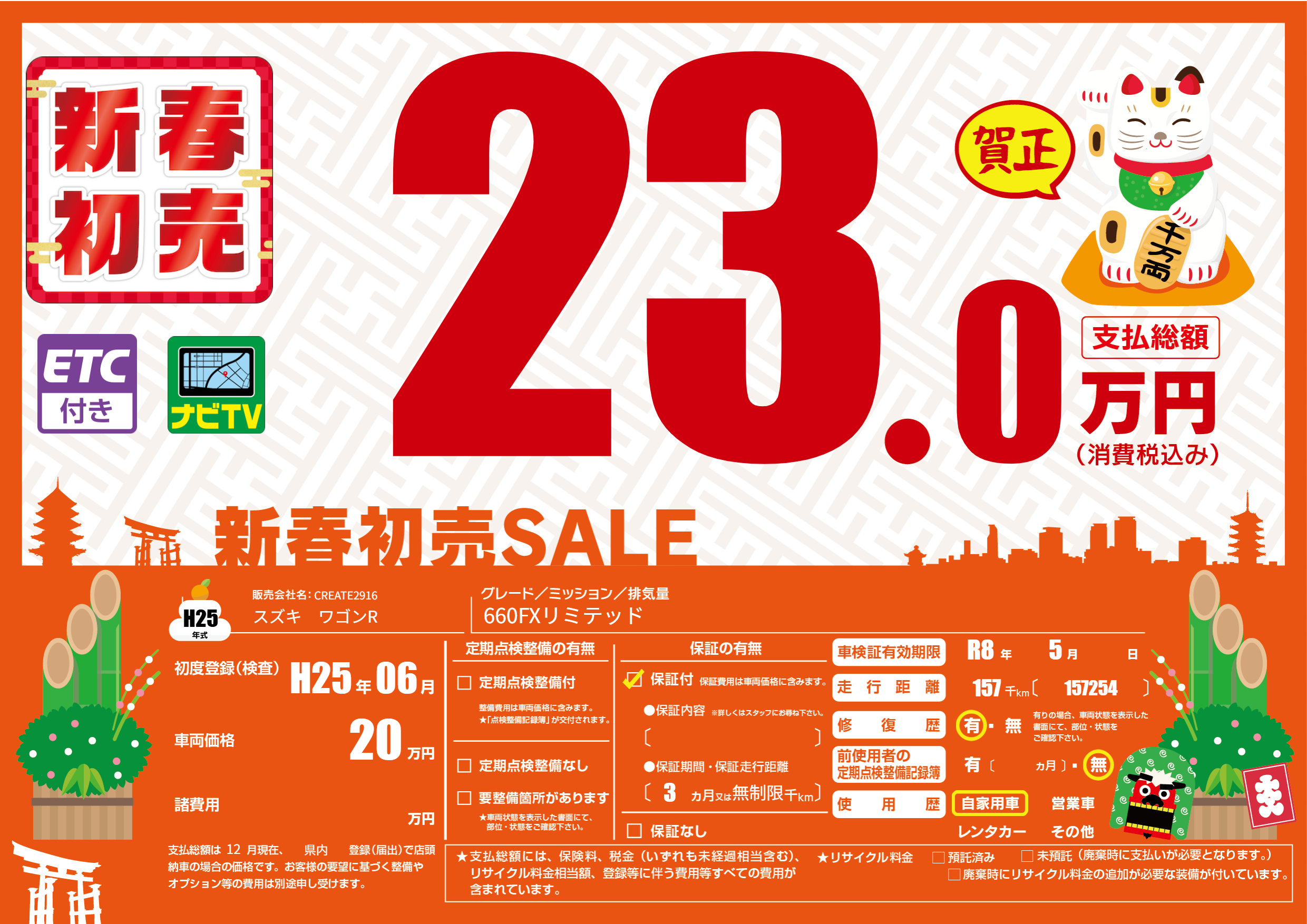 | 走行キロ | 15.7万km | 初年度登録 | H25年06月 |