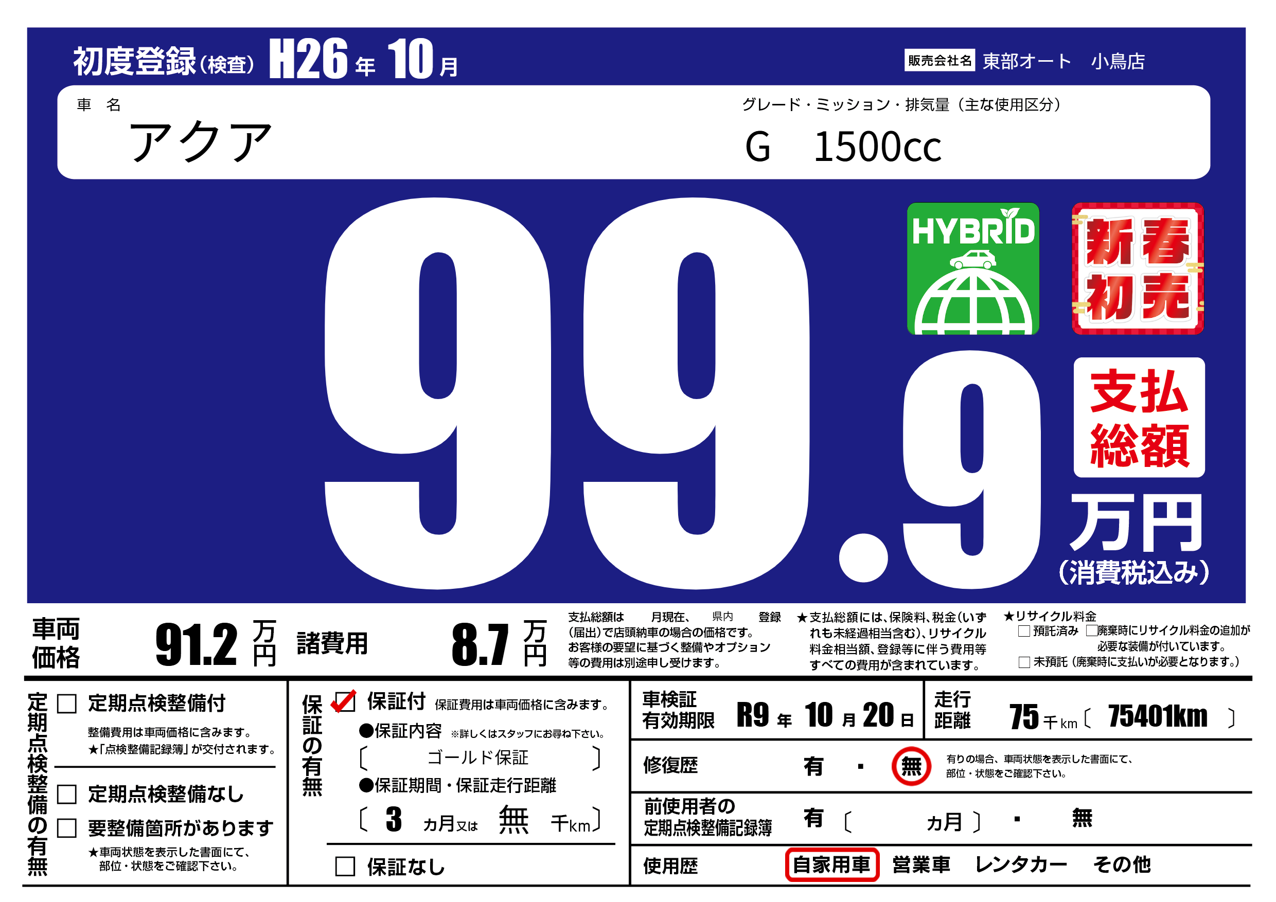 保証付き 保証内容( ゴールド保証) 3ヶ月または(無)千kmまで |