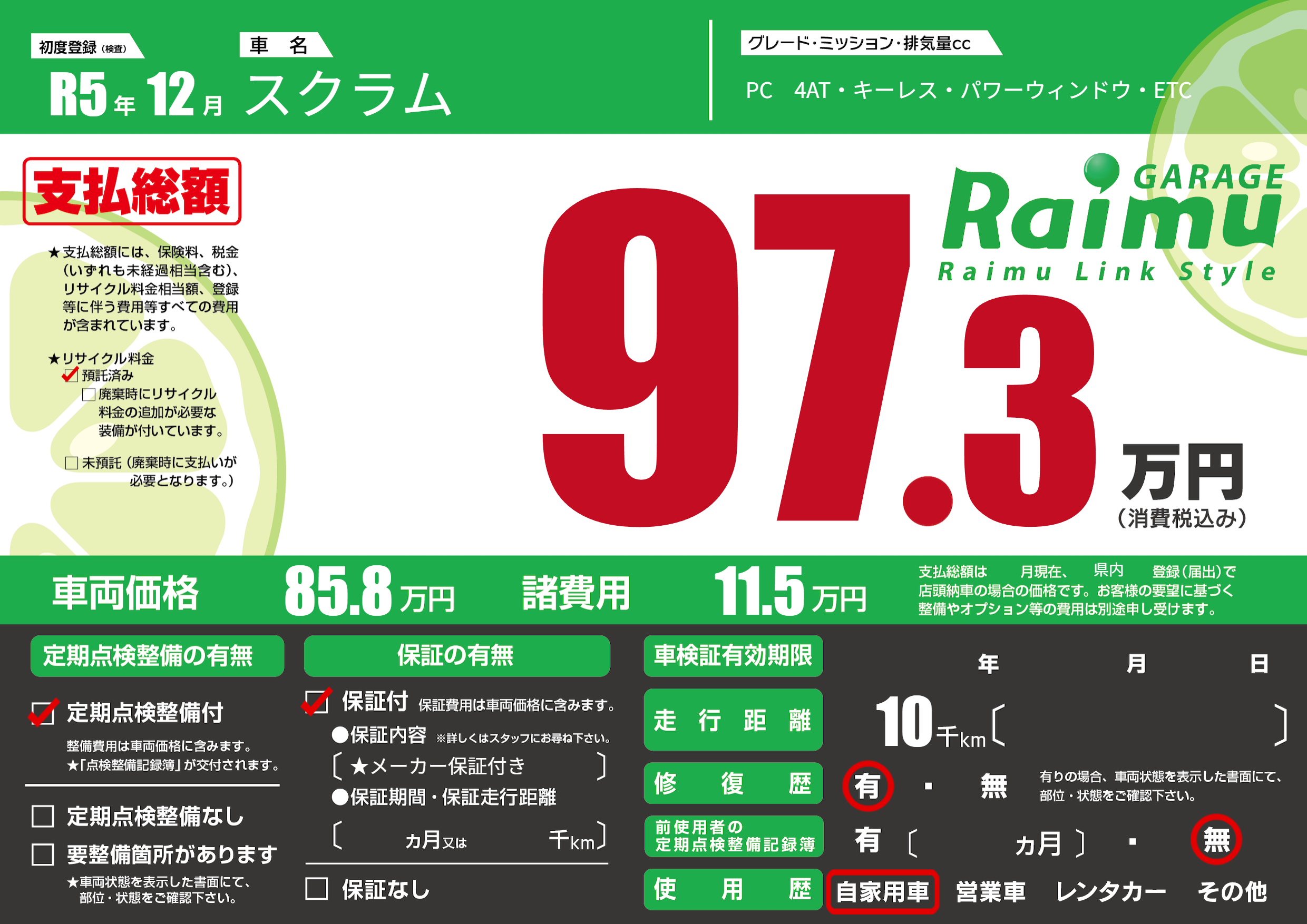 | 車名 | スクラム | グレード ミッション 排気量 |