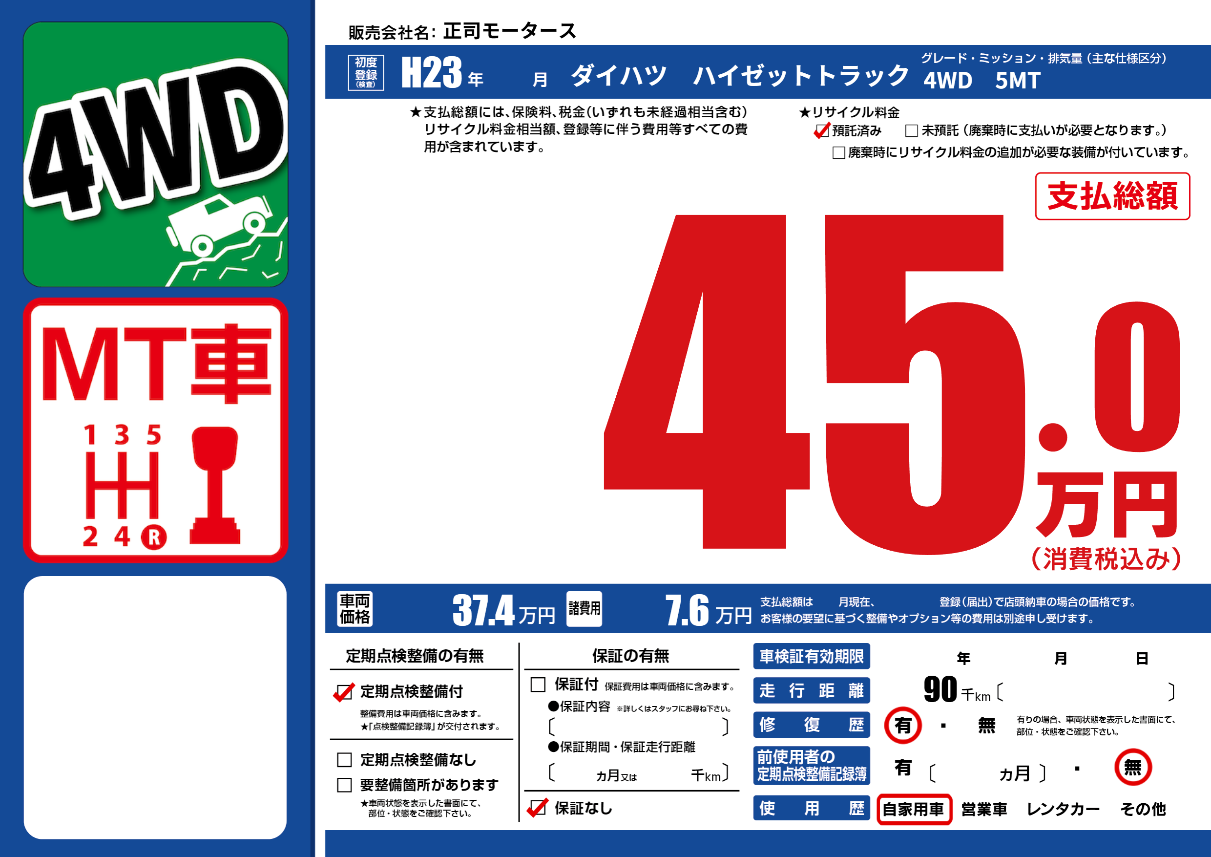 | 走行キロ | 9万km | 初年度登録 | H23年---月 |