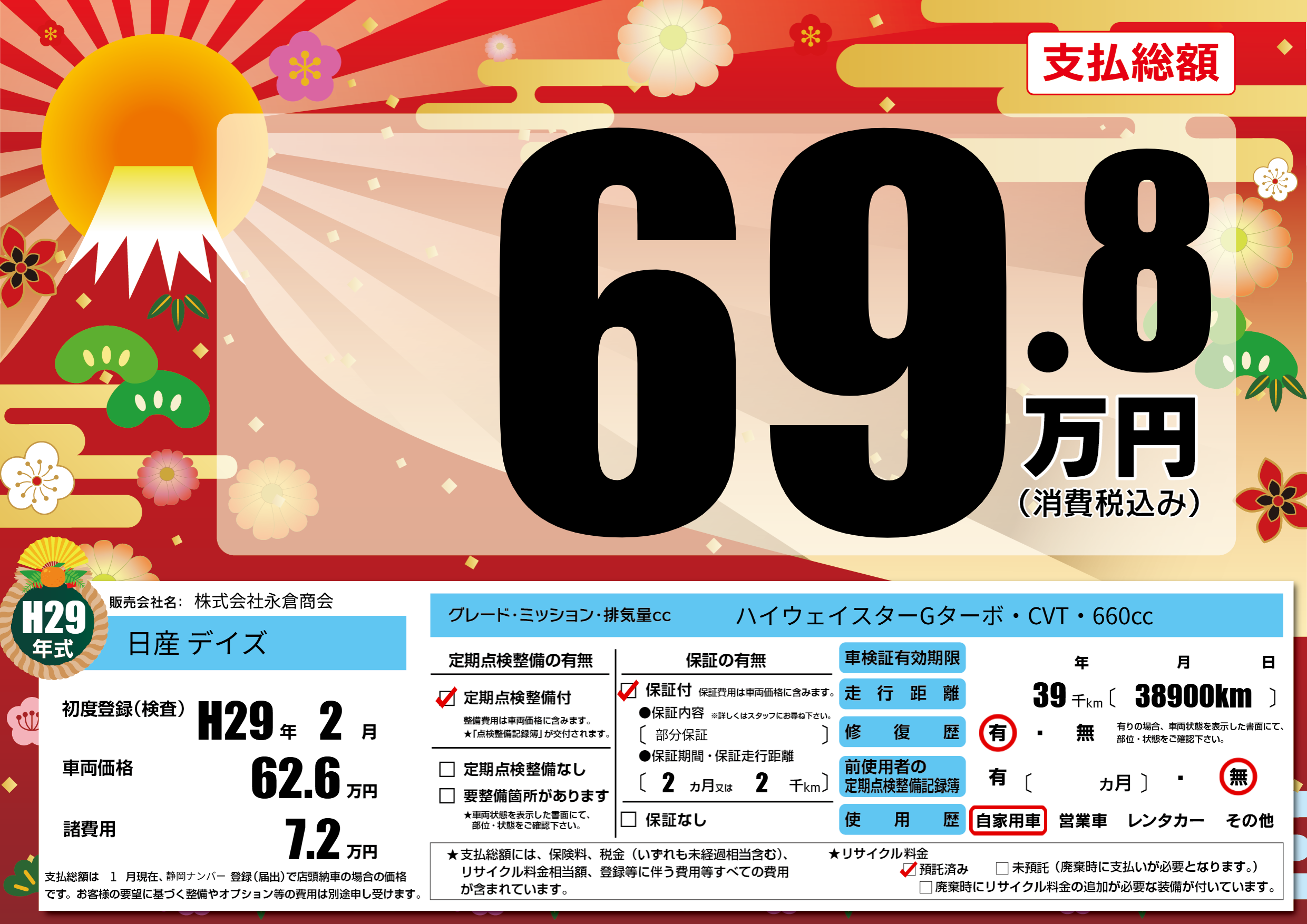 | 車名 | 日産 デイズ | グレード ミッション 排気量 |