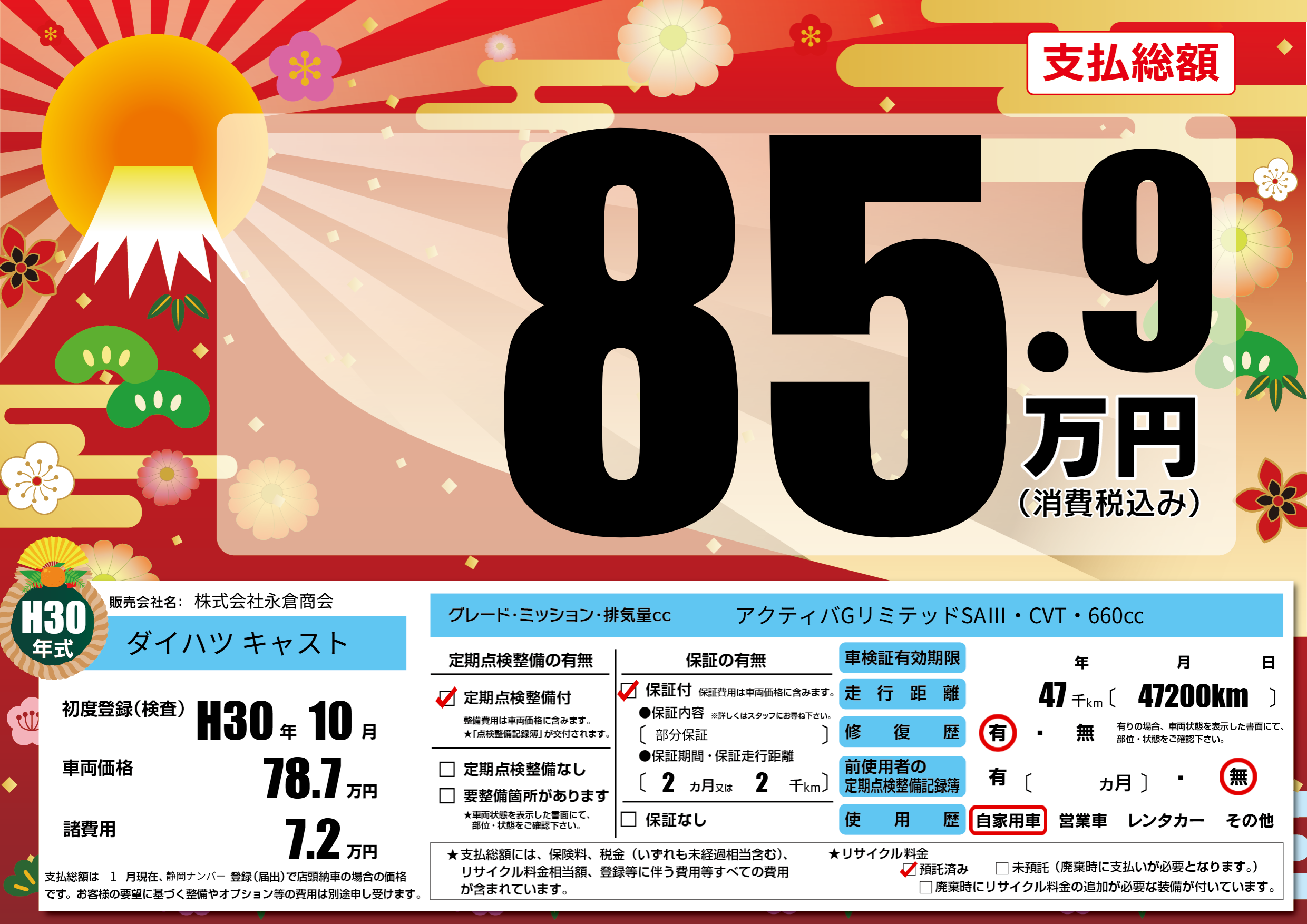 | 車名 | ダイハツ キャスト | グレード ミッション 排気量 |