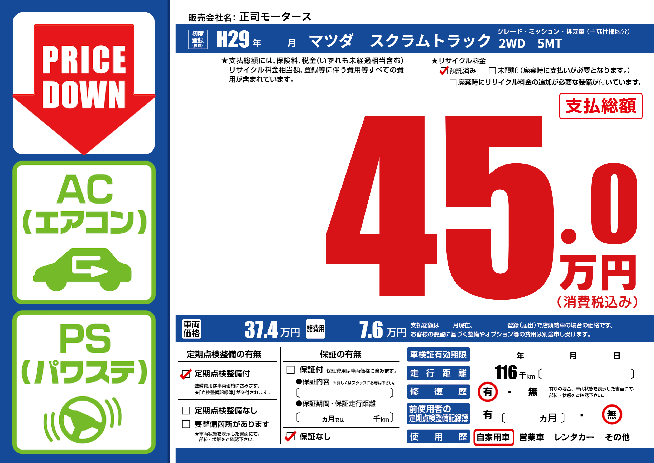 | 車名 | マツダ スクラムトラック | グレード ミッション 排気量 |