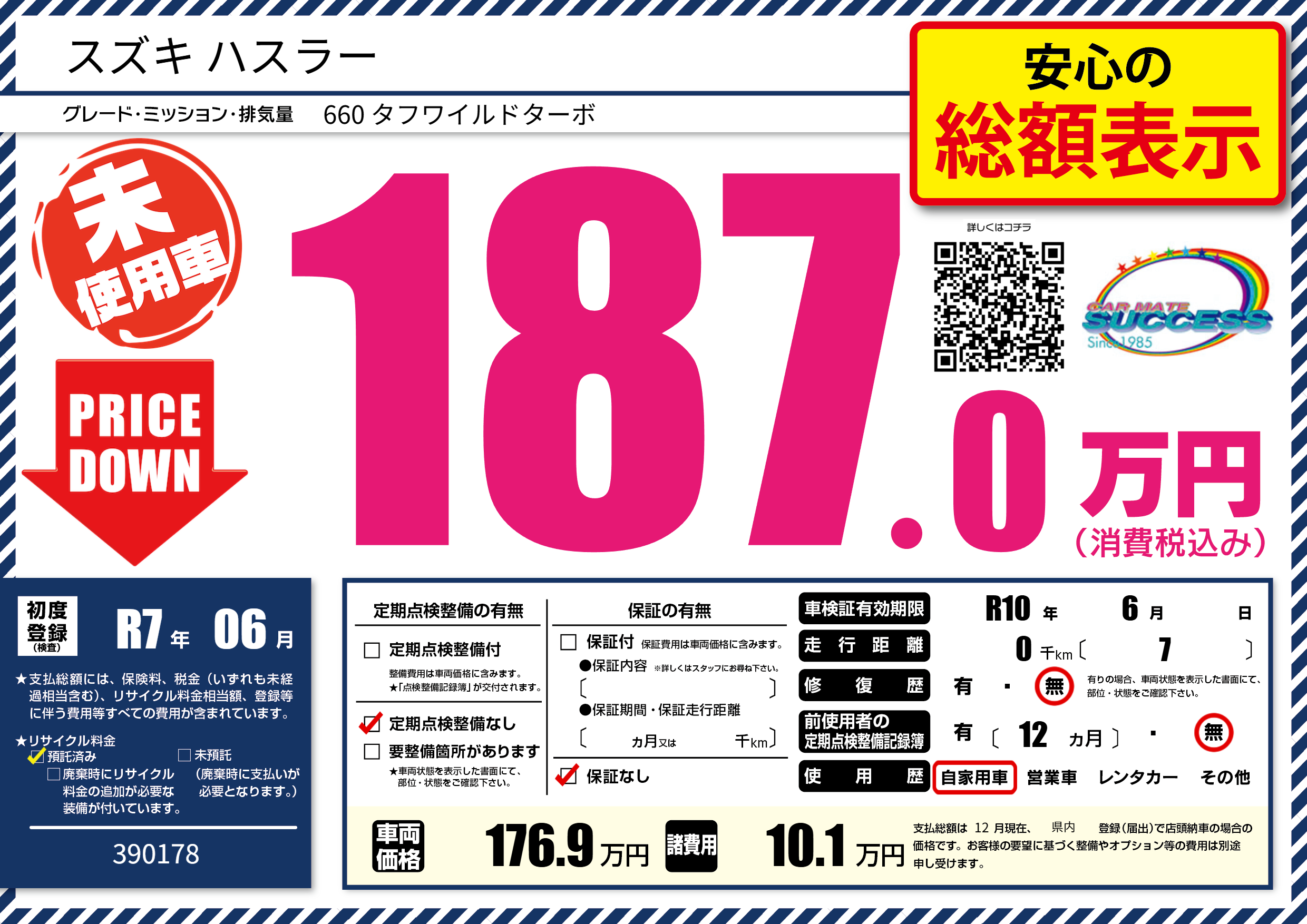 | 車名 | スズキ ハスラー | グレード ミッション 排気量 |
