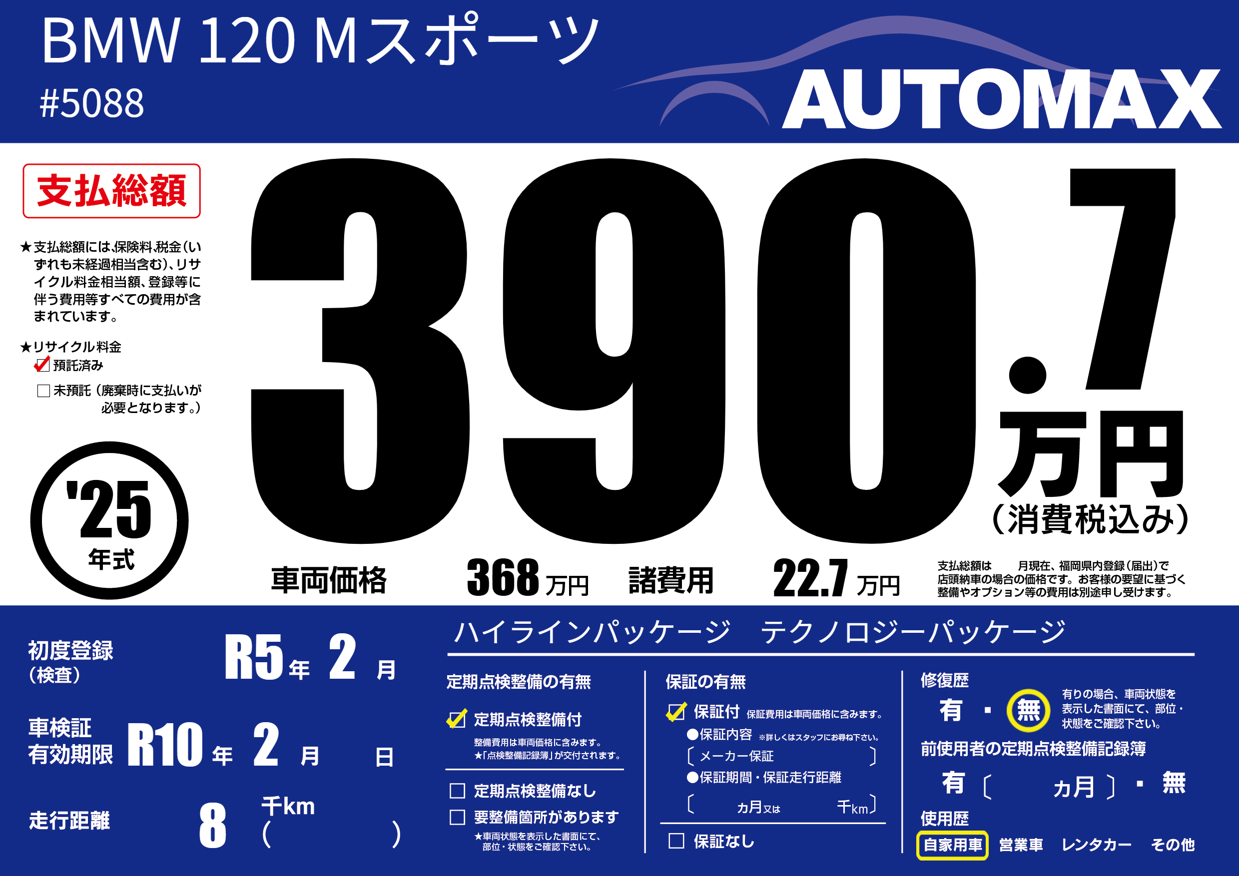 | 車名 | BMW 120 Mスポーツ | グレード ミッション 排気量 |