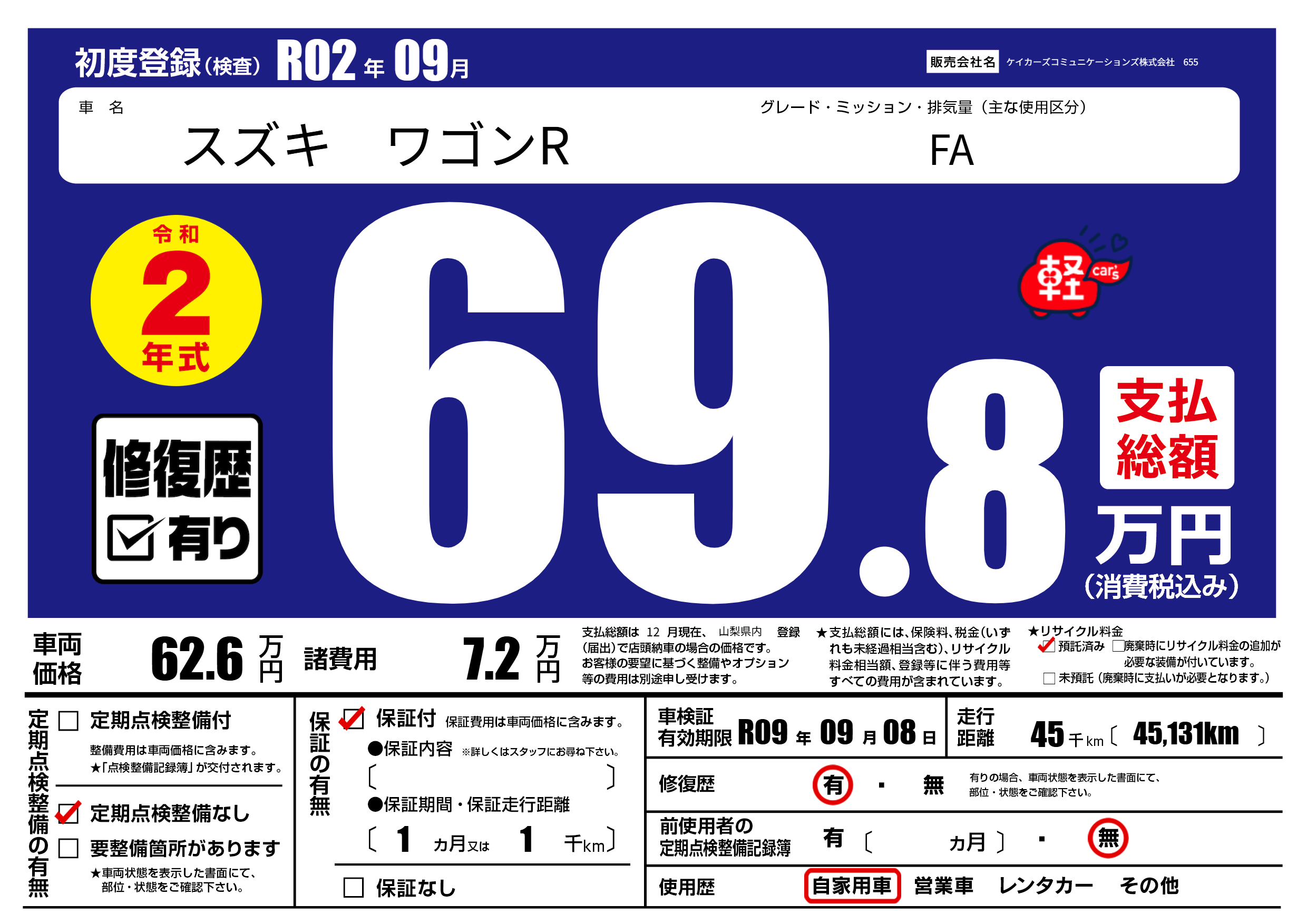 | 走行キロ | 4.5万km | 初年度登録 | R02年09月 |