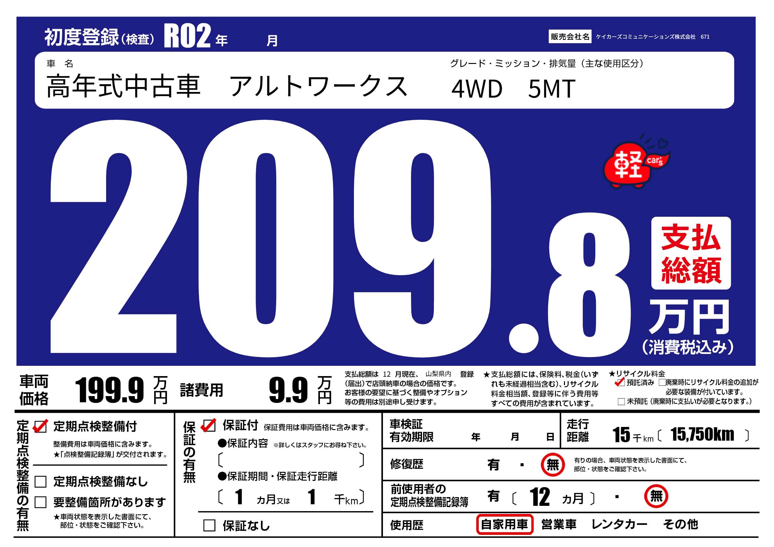 | 車名 | 高年式中古車 アルトワークス | グレード ミッション 排気量 |