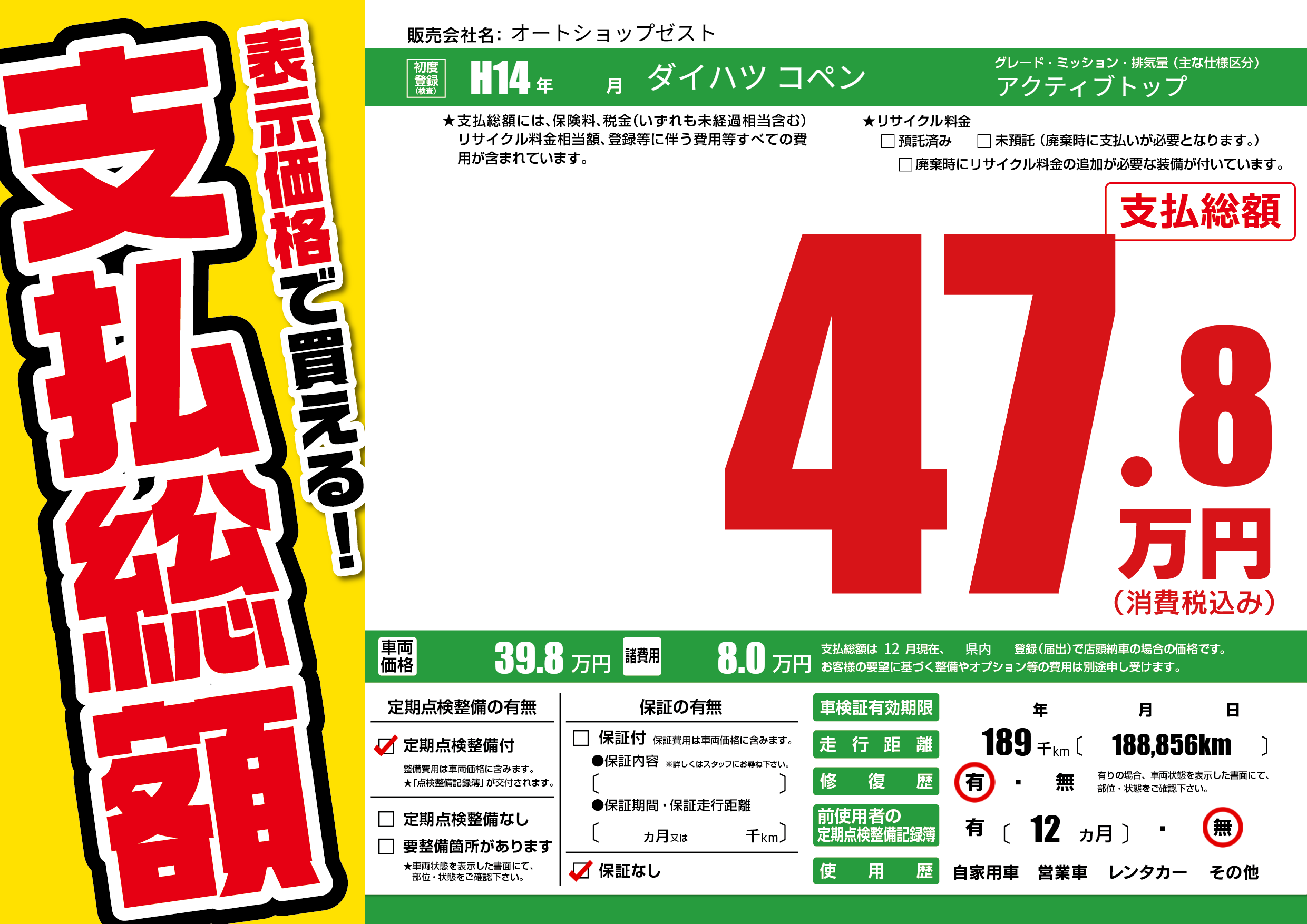 | 車名 | ダイハツ コペン | グレード ミッション 排気量 |