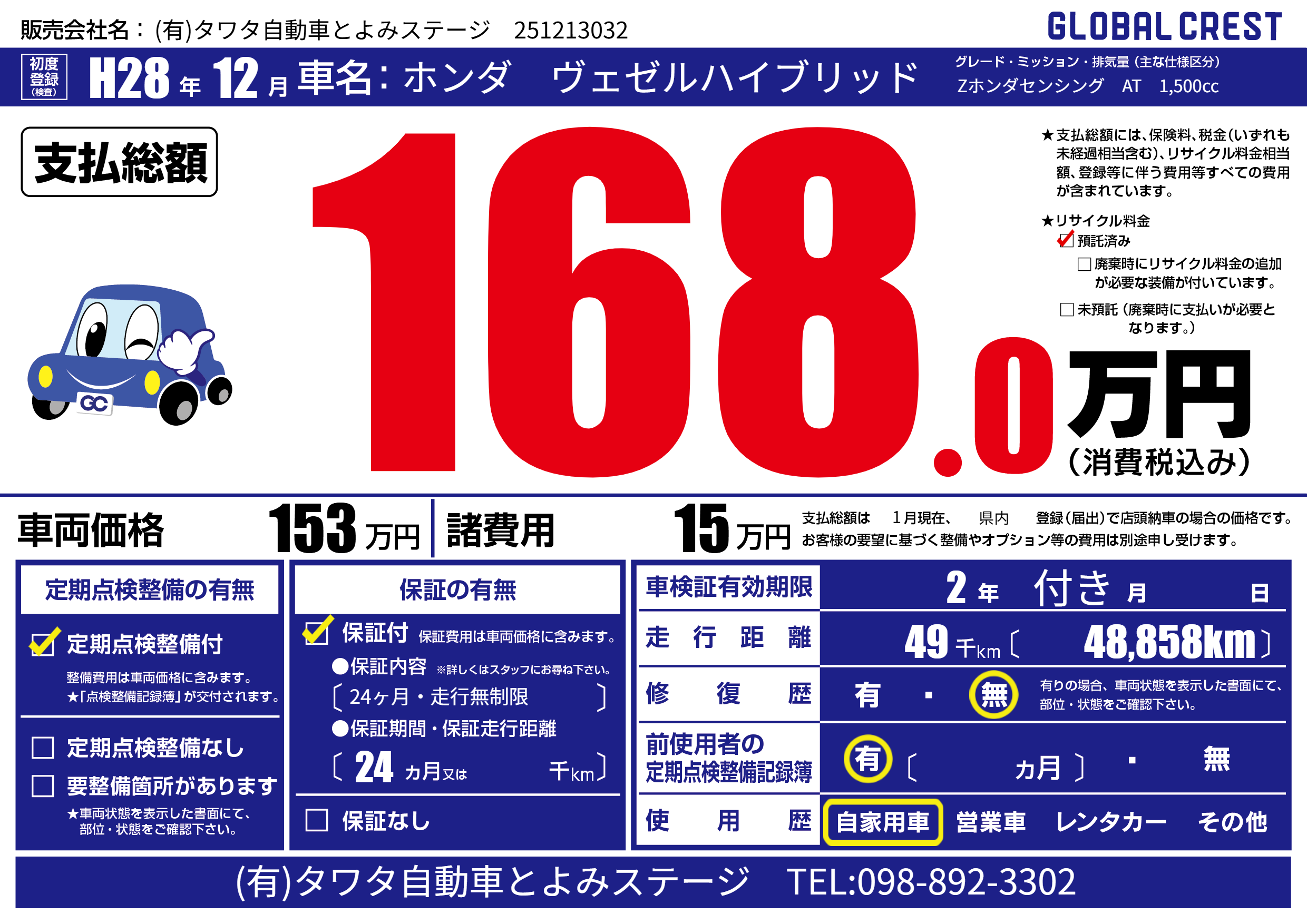 | 車名 | ホンダ ヴェゼルハイブリッド | グレード ミッション 排気量 |