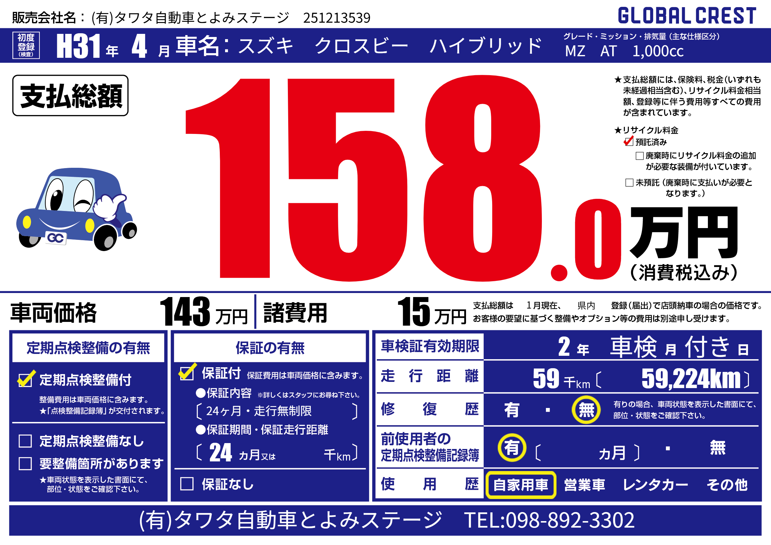 | 車名 | スズキ クロスビー ハイブリッド | グレード ミッション 排気量 |