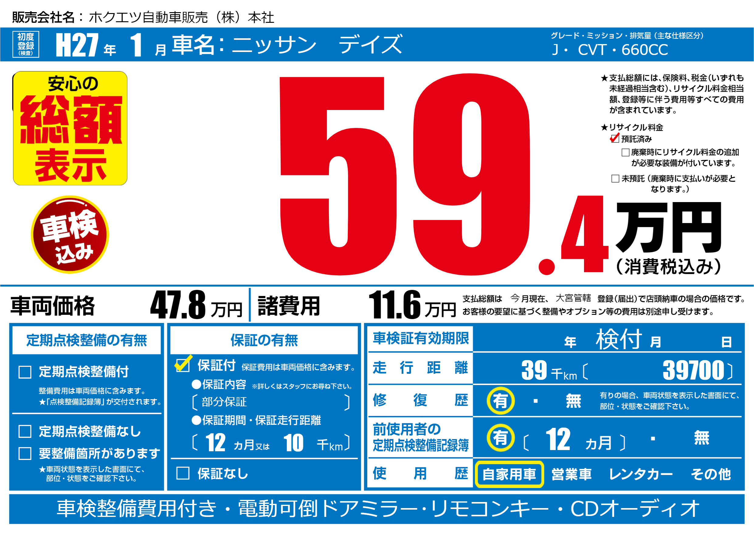 | 車名 | ニッサン デイズ | グレード ミッション 排気量 |