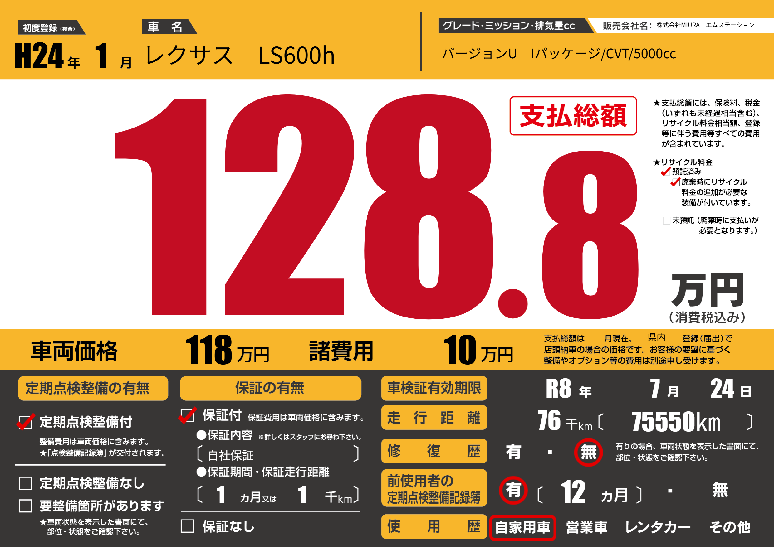 | 走行キロ | 7.6万km | 初年度登録 | H24年1月 |