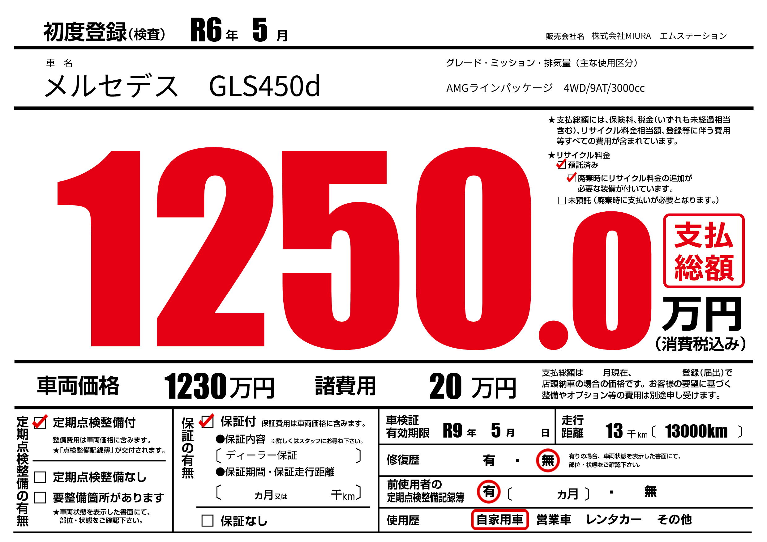 | 車名 | メルセデス GLS450d | グレード ミッション 排気量 |