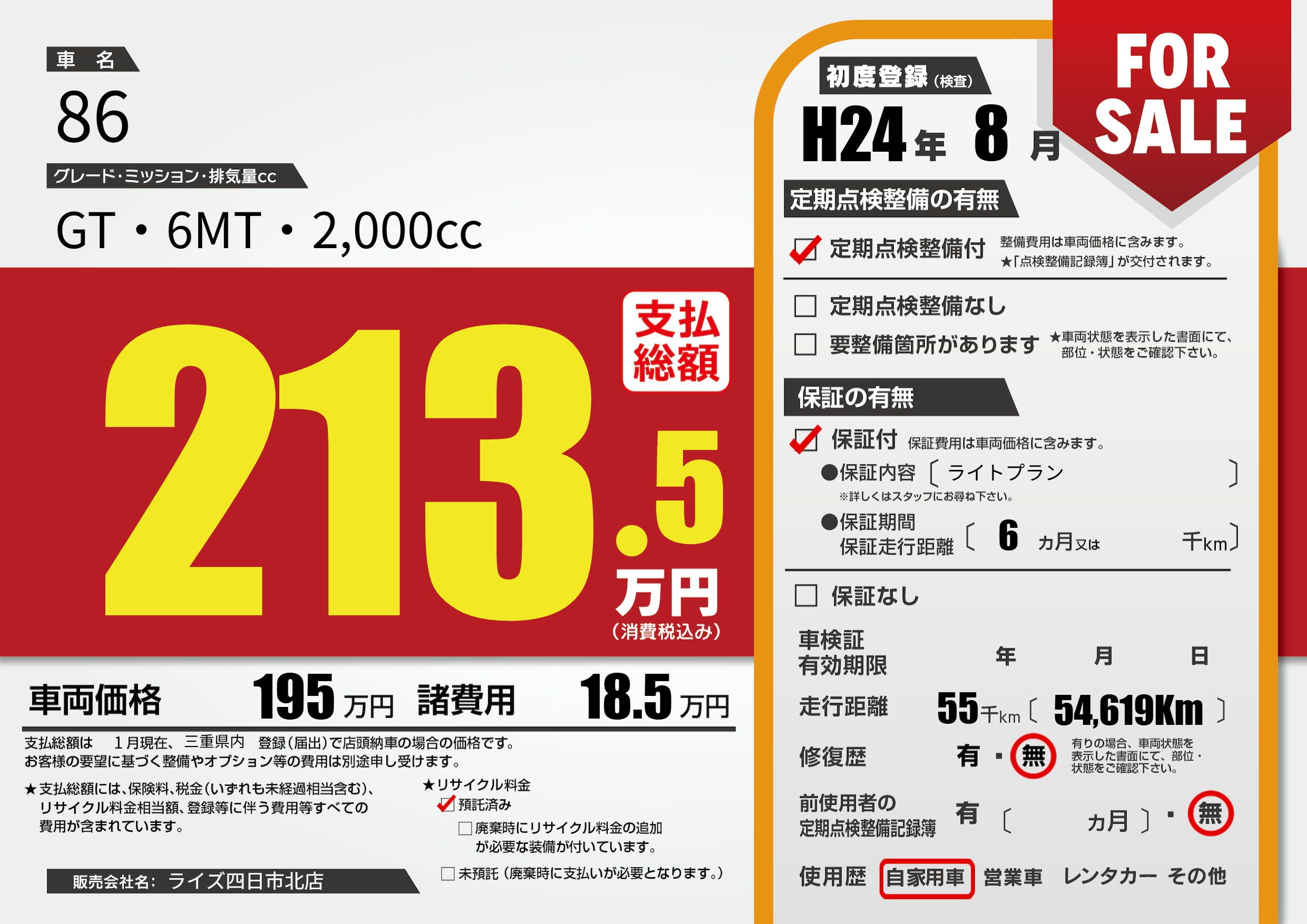 | 走行キロ | 5.5万km | 初年度登録 | H24年8月 |