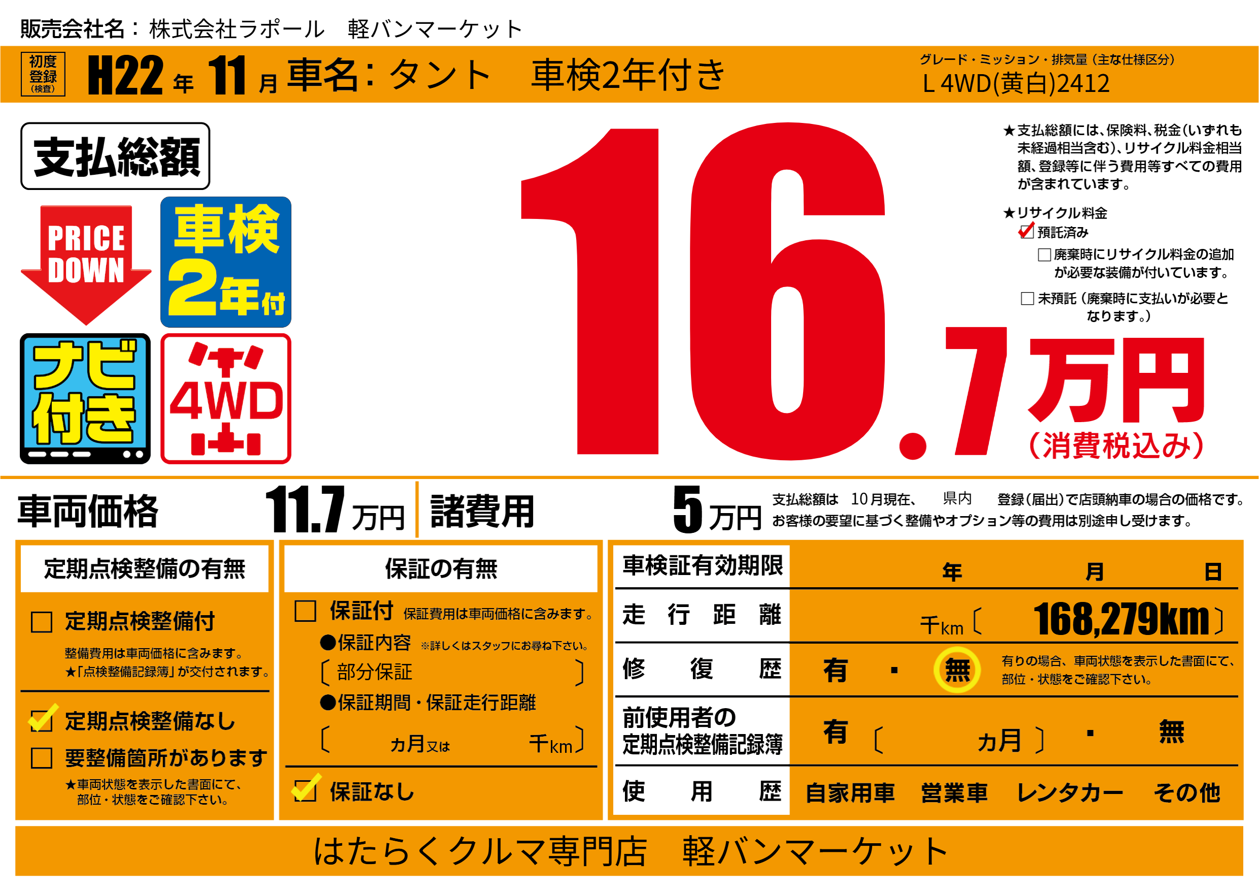 | 車名 | タント 車検2年付き | グレード ミッション 排気量 |